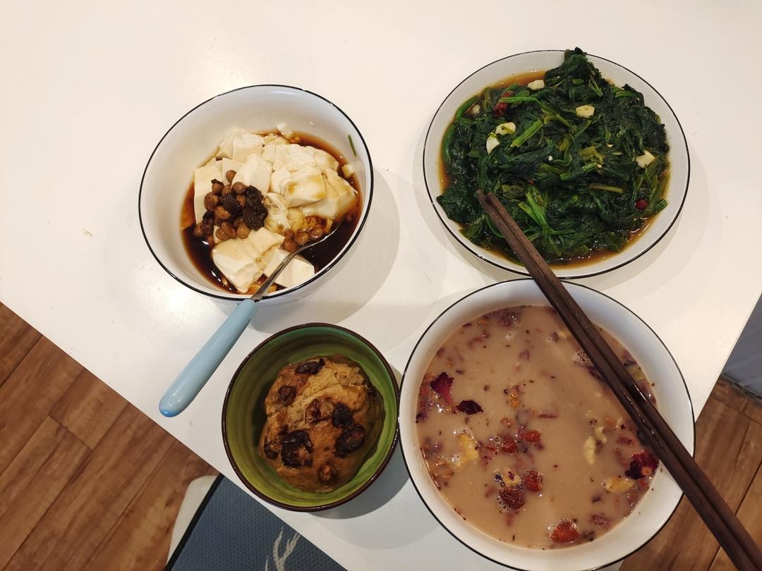 酱汁拌豆腐,清炒菠菜,红糖核桃馒头,红豆苹果豆浆饮