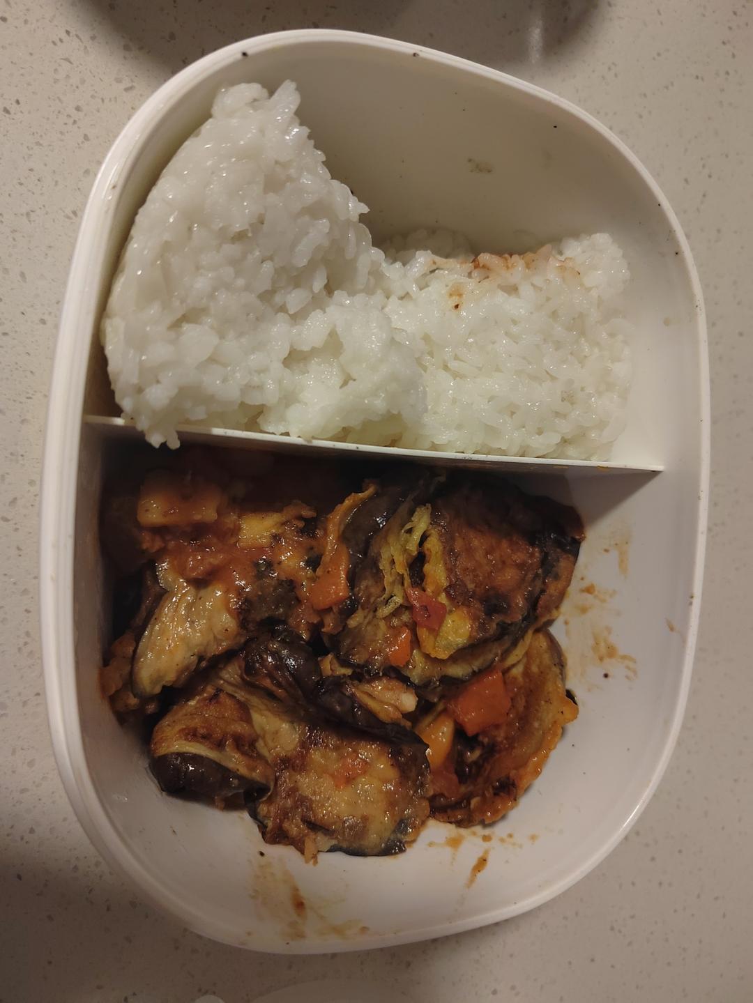 煎的茄子饼,用番茄牛腩的预制菜炒了一遍,配米饭吃,刚好