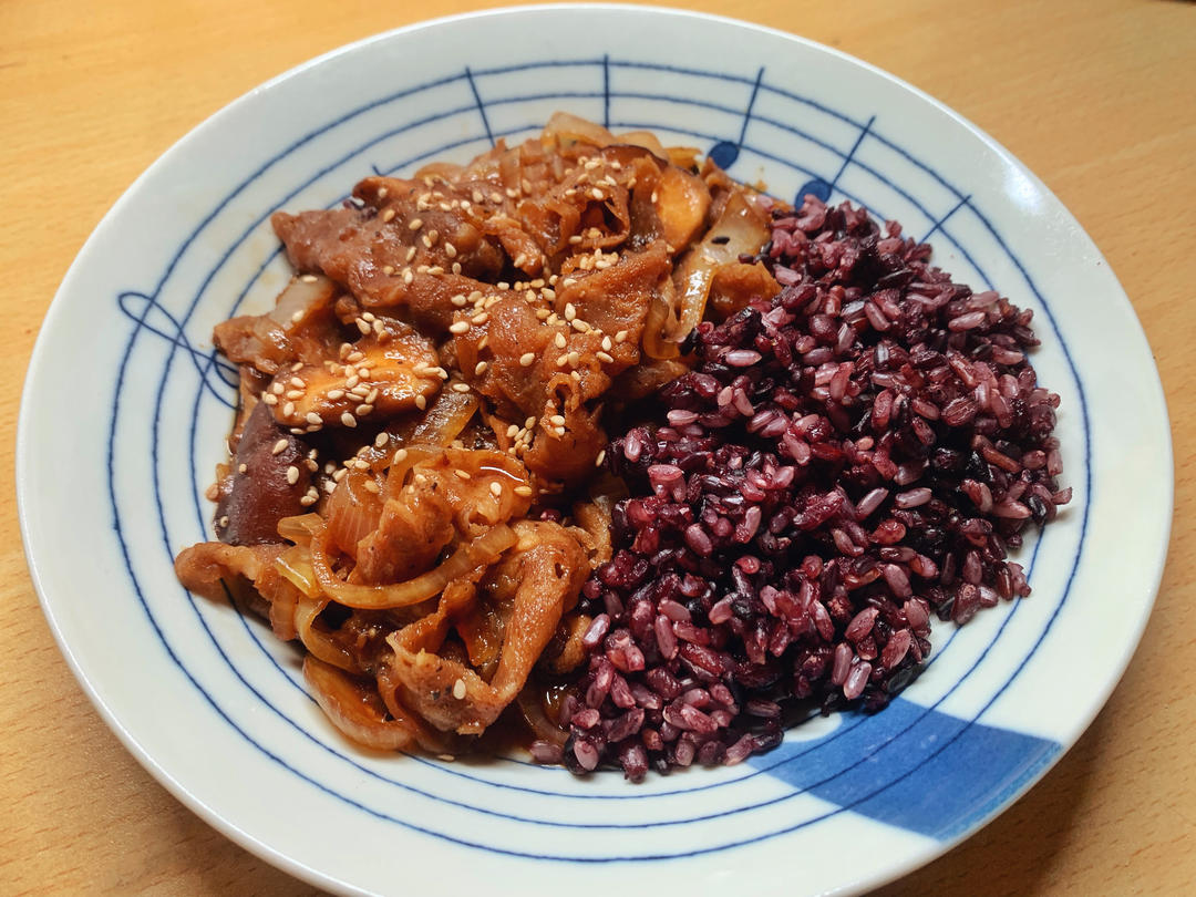 洋葱香菇照烧肥牛,杂粮饭。