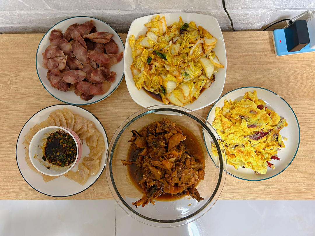蒸腊肠,醋溜白菜,辣椒炒鸡蛋,猪皮冻。