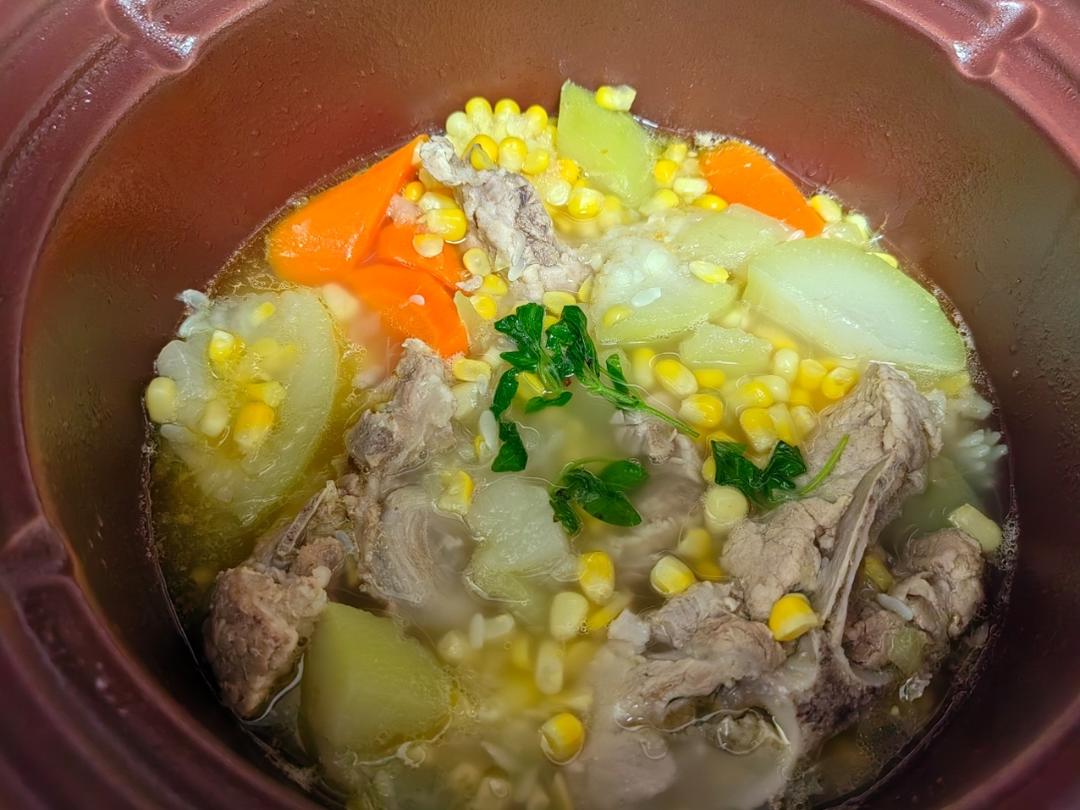 昨日午餐:冬瓜脊骨汤。(放了点现有的莲子薏米赤小豆,炖个广式养生汤)