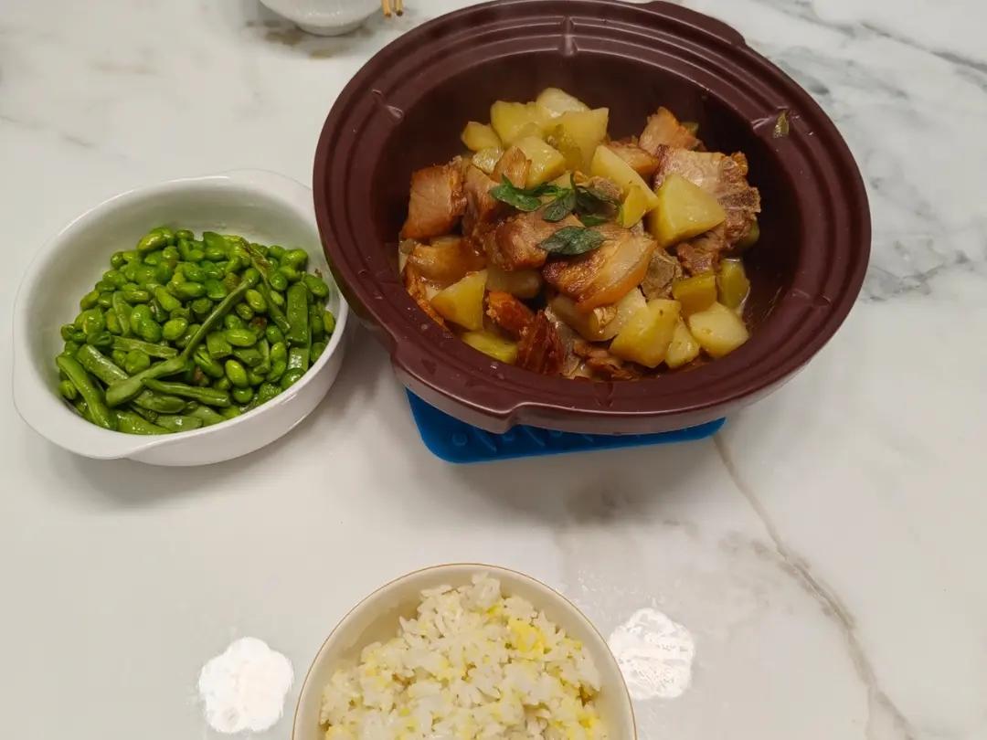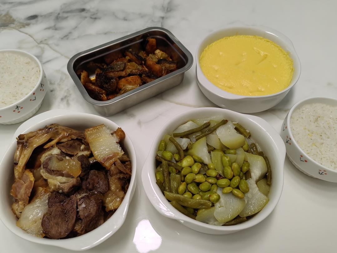 午餐:萝卜炖腊肉,毛豆米炒四季豆,煮大米小米饭 (萝卜不当季,口感略苦,冬天的萝卜就...