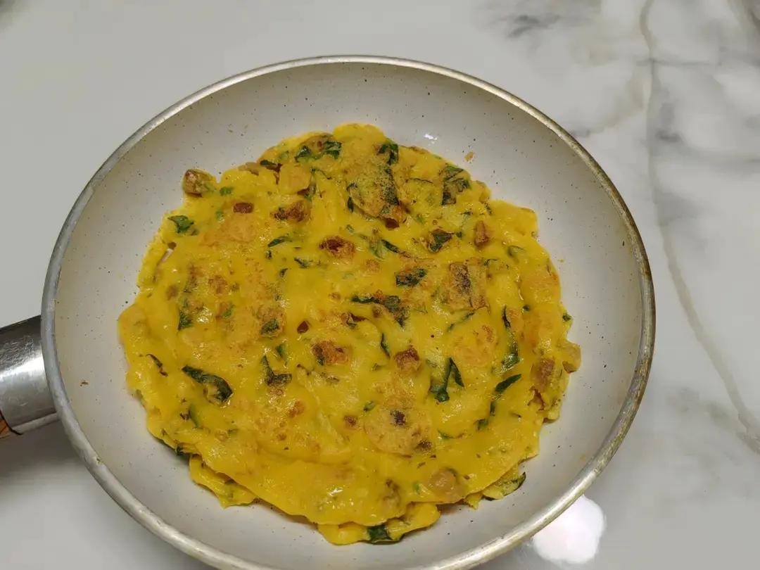 早餐:土豆泥荆芥煎蛋饼 (放了蒸熟的土豆泥,面粉,鸡蛋,盐,荆芥,还有香肠丁)
