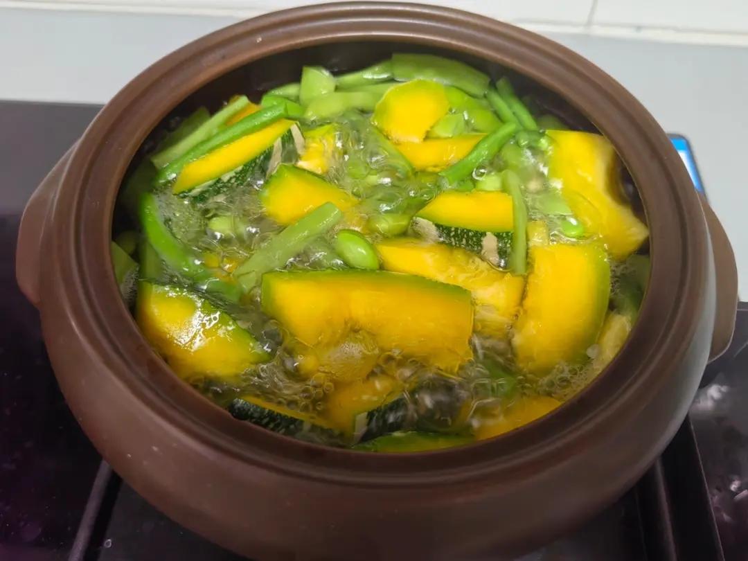 晚餐:跟风做个网上刷到的瓜豆汤,嫩南瓜加四季豆(我又放了点豇豆和毛豆米)这天热的真...