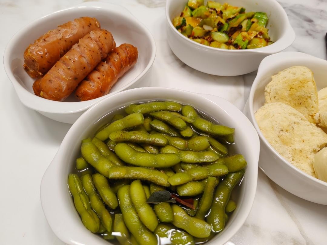 晚餐加夜宵:空气炸锅烤肠,盐水煮毛豆,黄瓜拌皮蛋,烤馒头片。