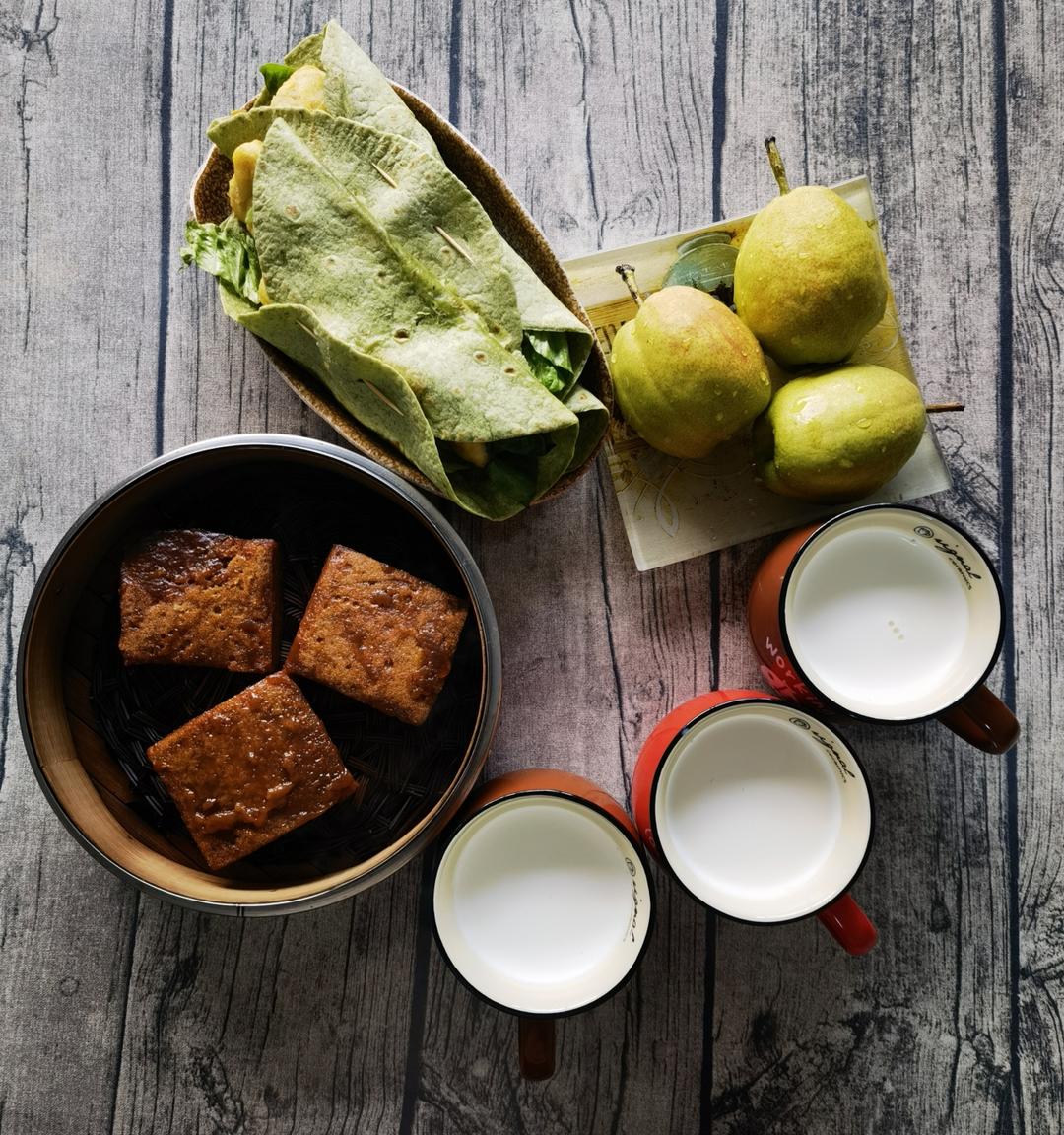 第2844餐:牛奶、鸡肉卷、红糖糕、香梨!