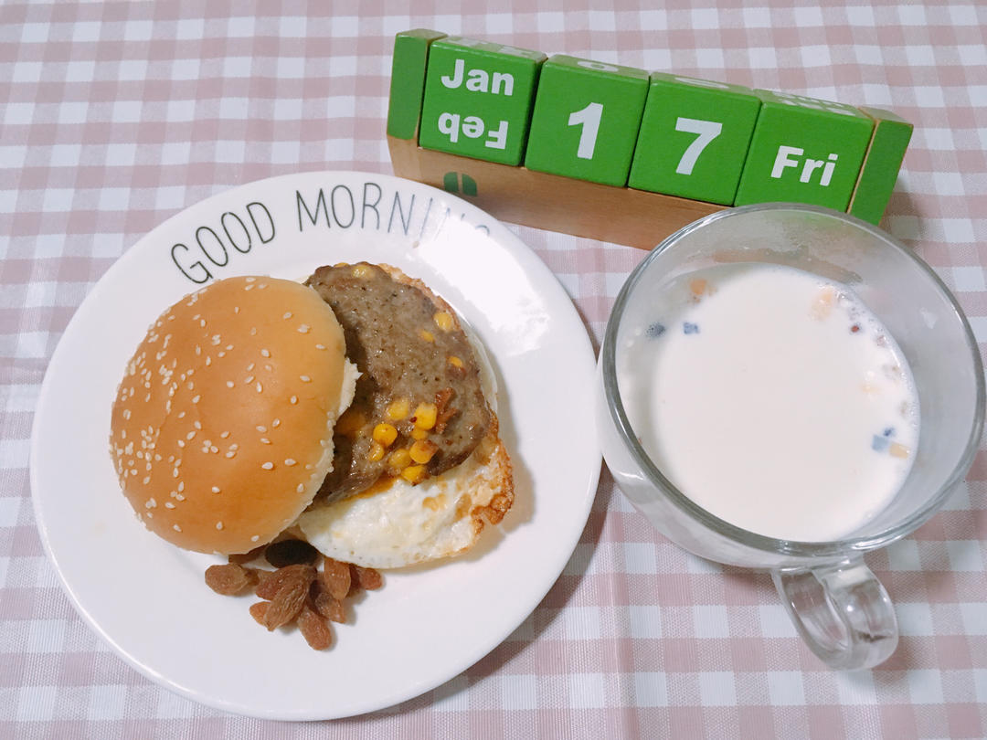 ㋀㏰放假第5️⃣天 黑椒玉米🌽牛肉饼汉堡🍔加煎蛋🍳配牛奶🥛麦片佐葡萄🍇干