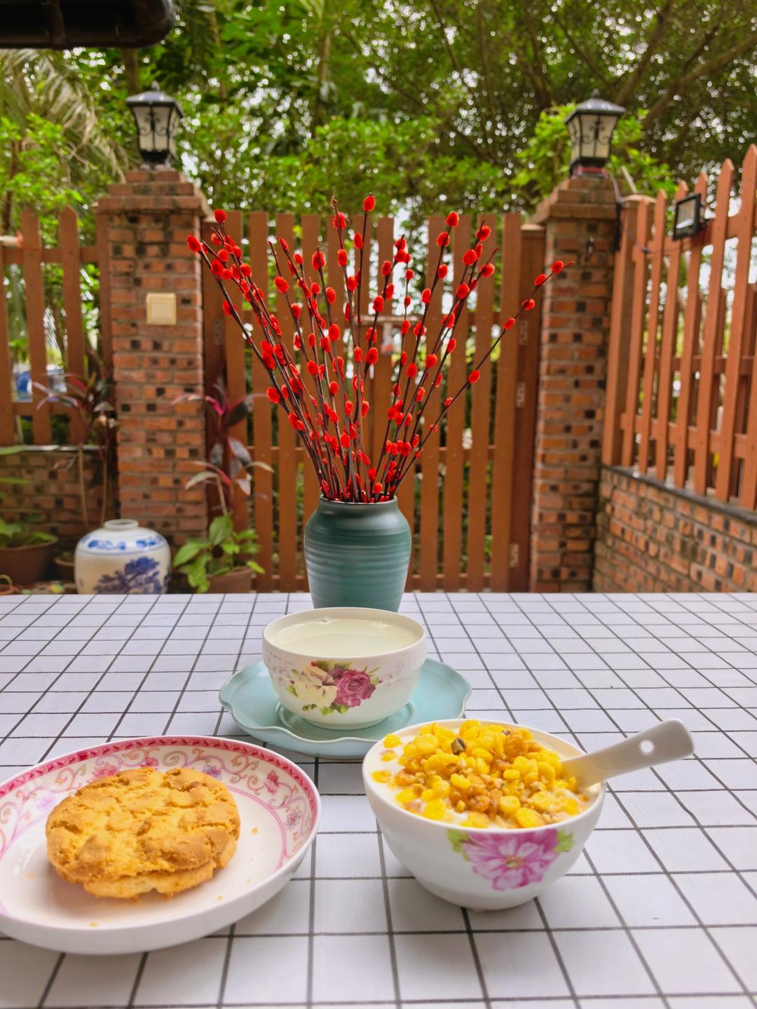 【早餐心语】爱生活这件事,永远来得及。自制原味酸奶+自制粗粮坚果酥、桃酥、米汤。