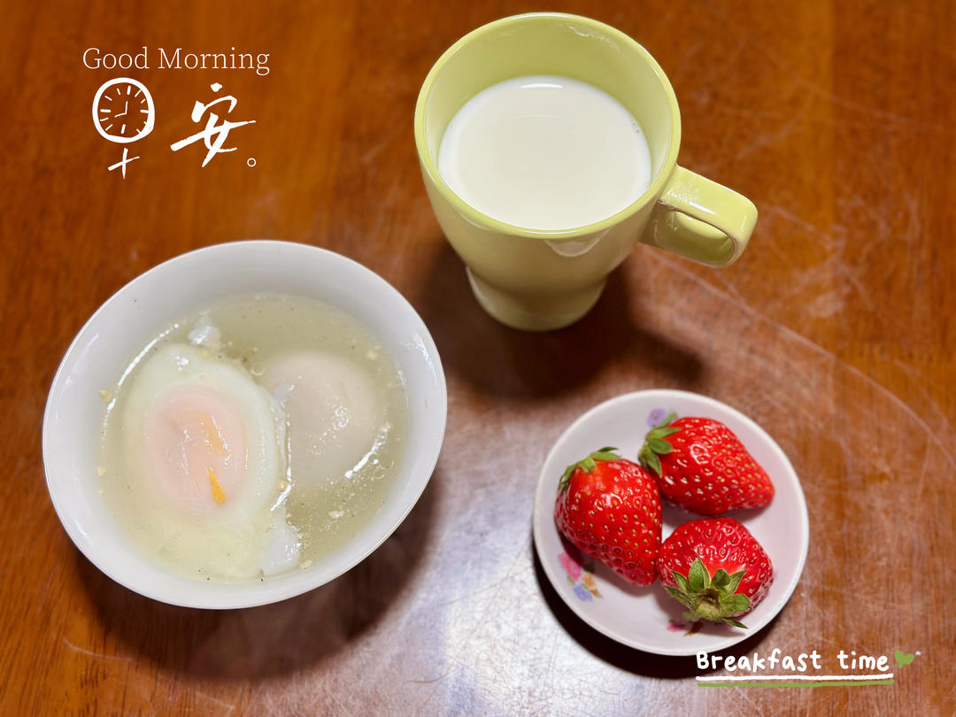 汤圆水波蛋+草莓🍓+牛奶🥛