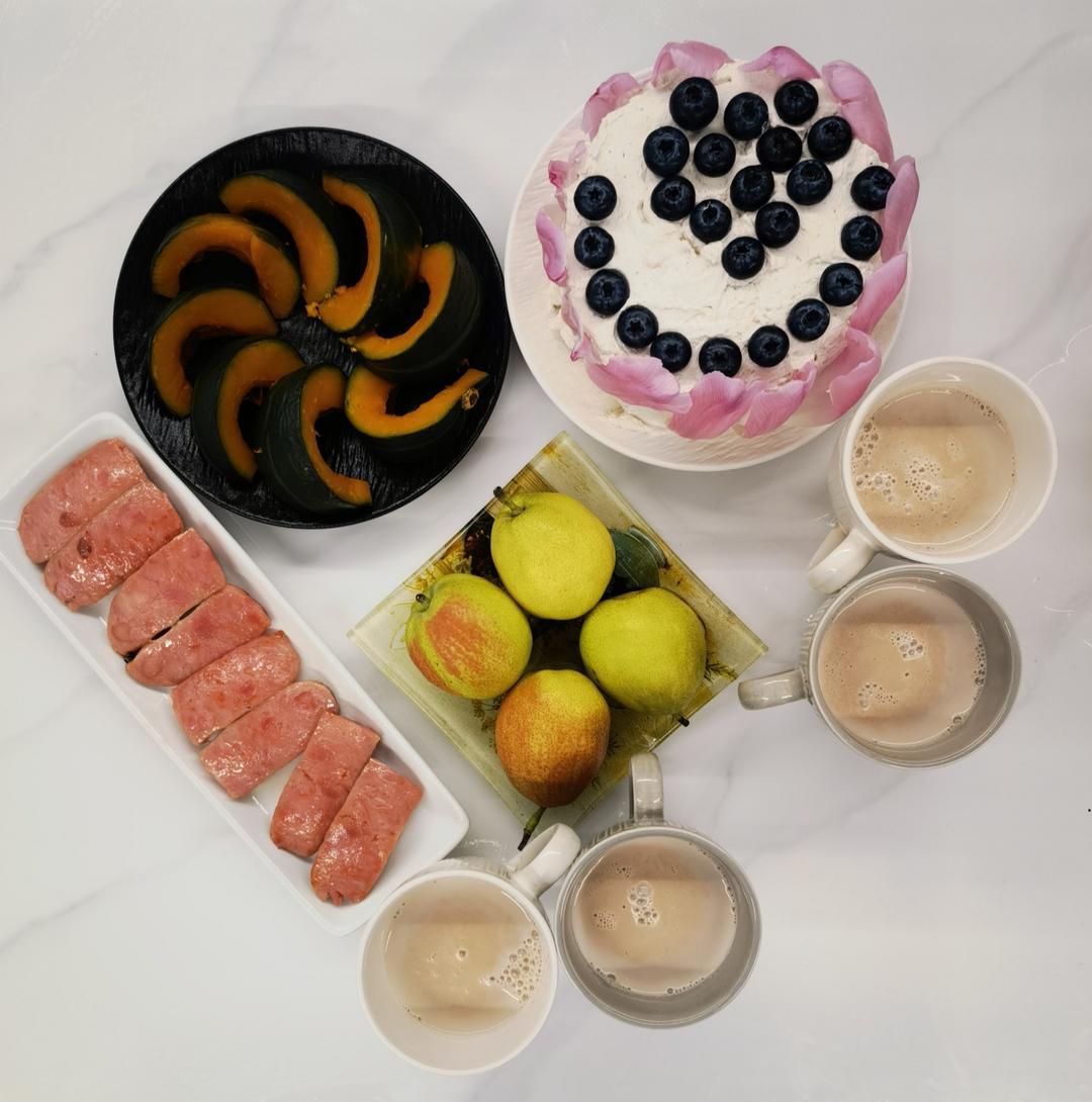 第2854餐:红枣核桃豆浆、蓝莓奶油蛋糕、肉肠、贝贝南瓜、香梨!