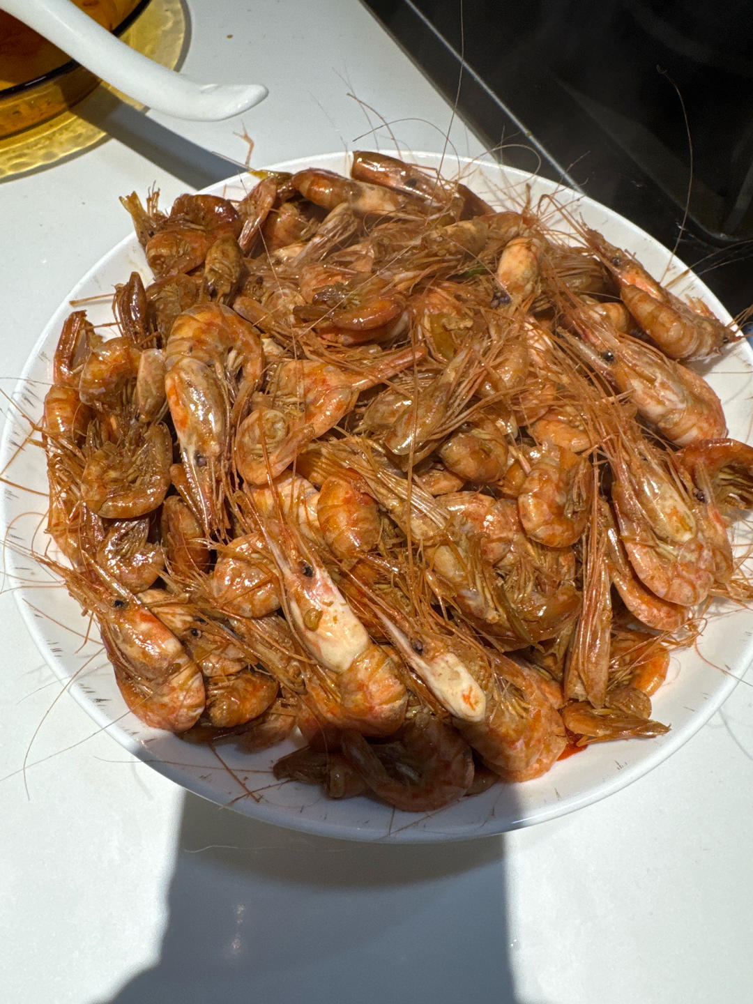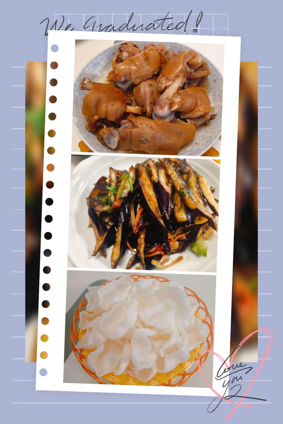 今日晚餐:酱香猪蹄,风味茄子,炸虾片。