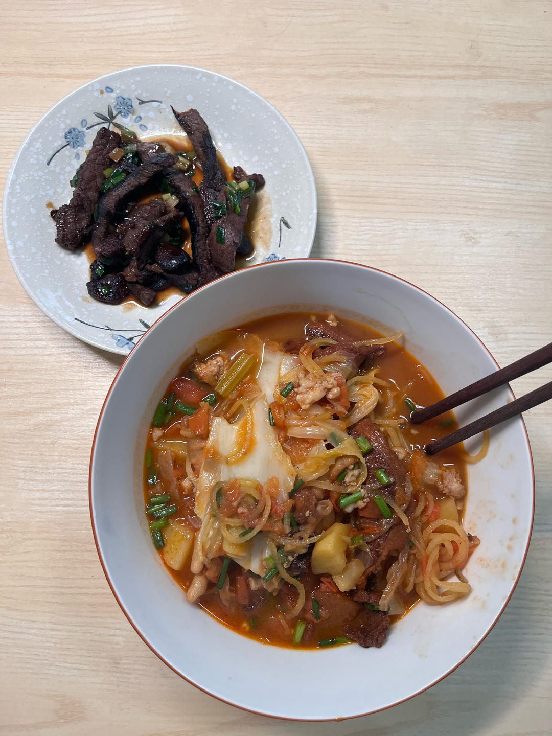 把昨儿打包回来的夺夺锅剩菜给煮了,家里刚好还有个西红柿,切碎了炒了做锅底,...