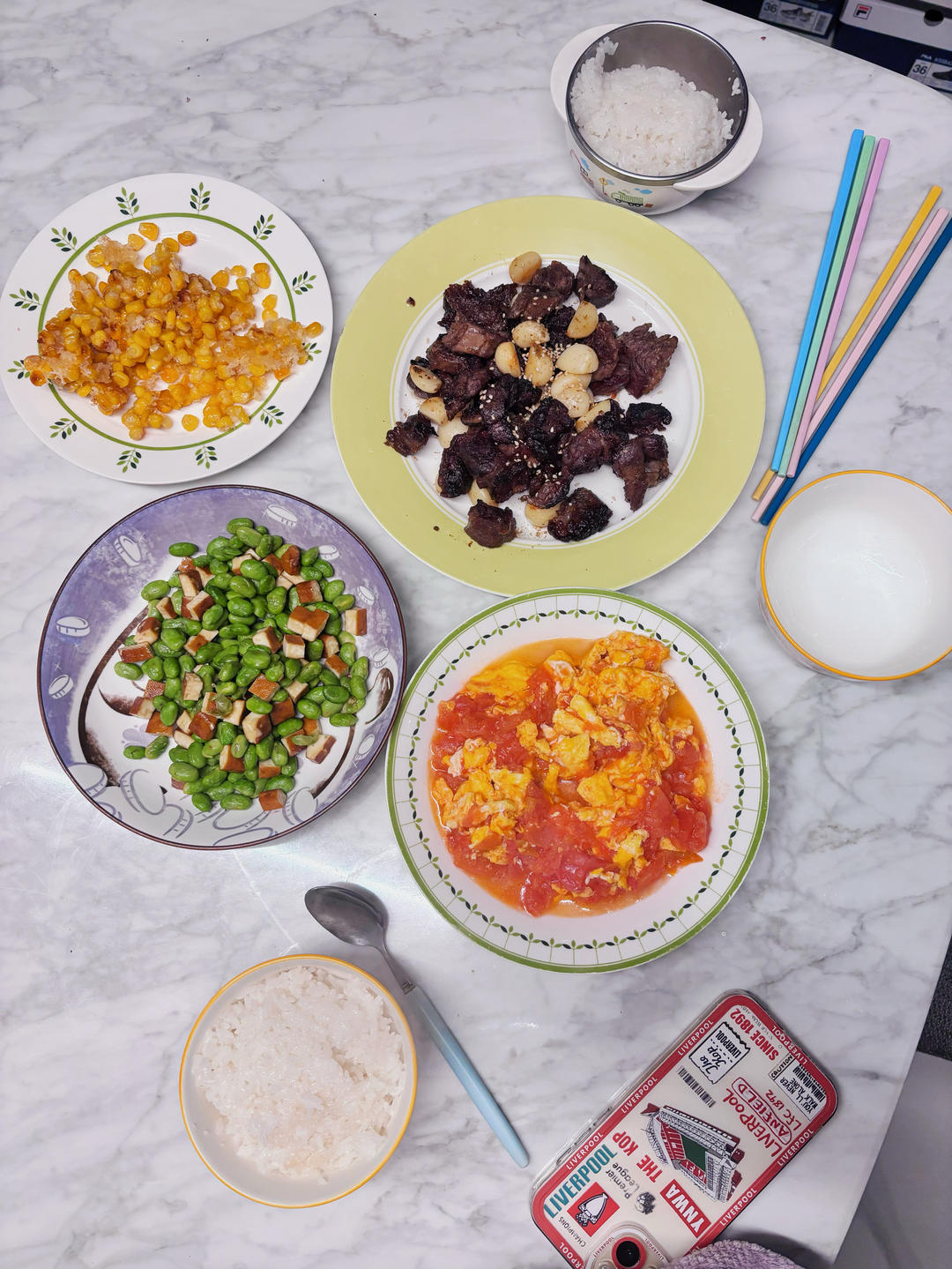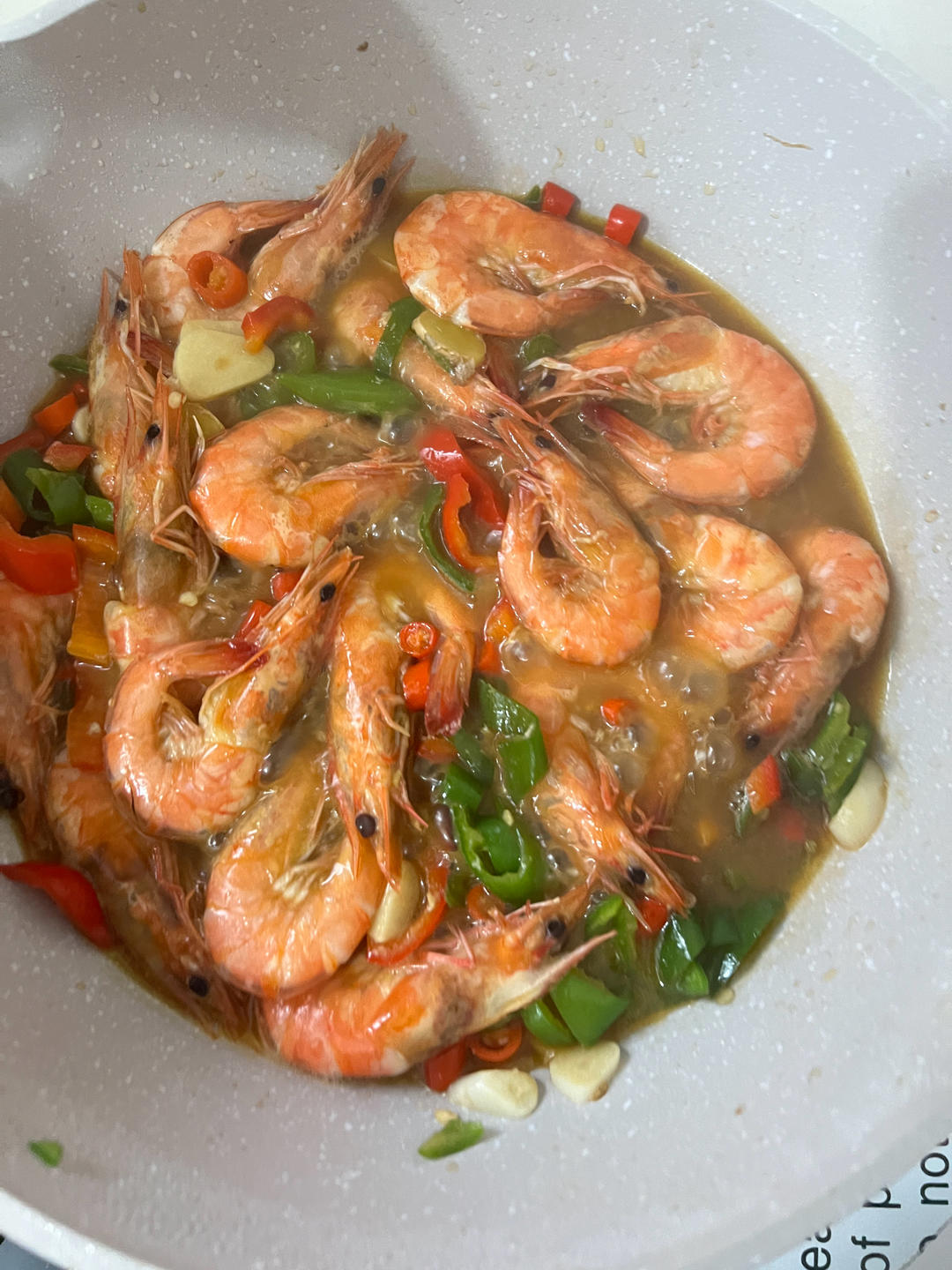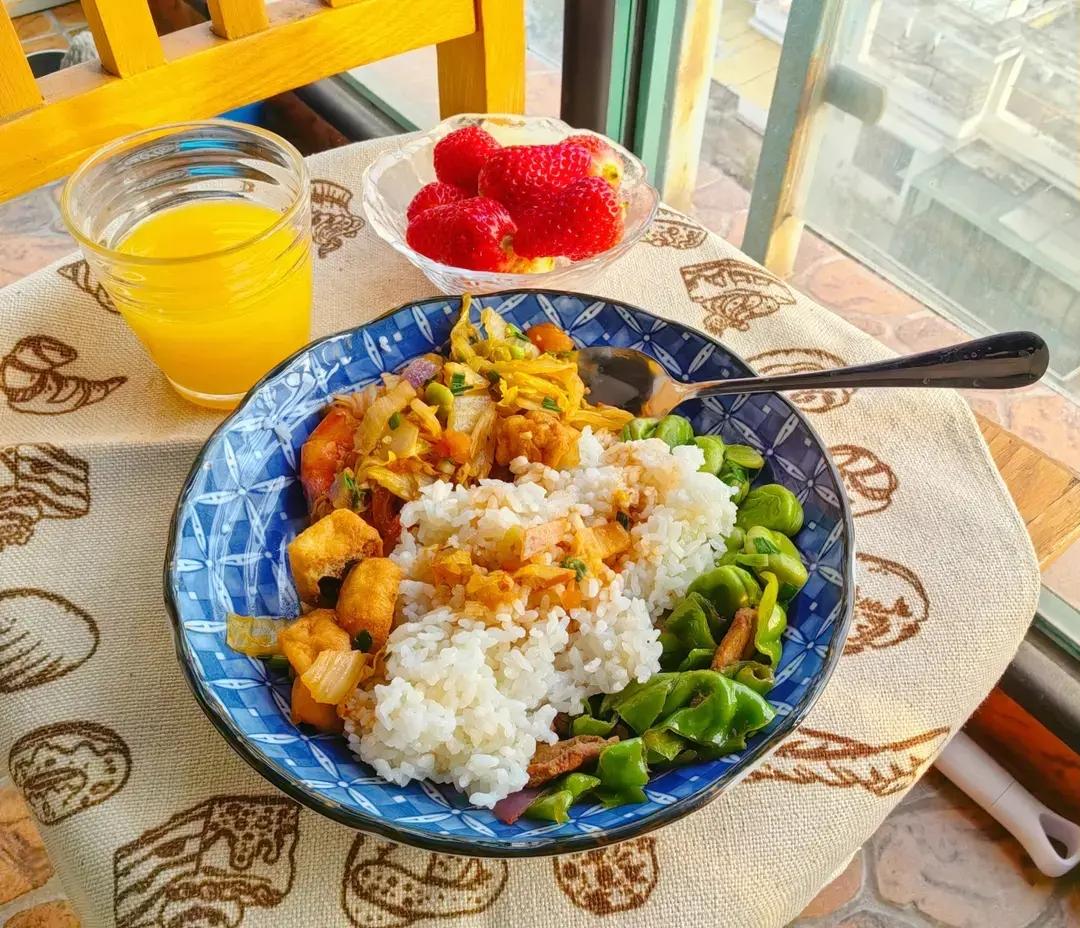 又回到“盖浇饭”Style。今天,辣椒炒肉,葱油蚕豆,家烧大虾,配米饭。