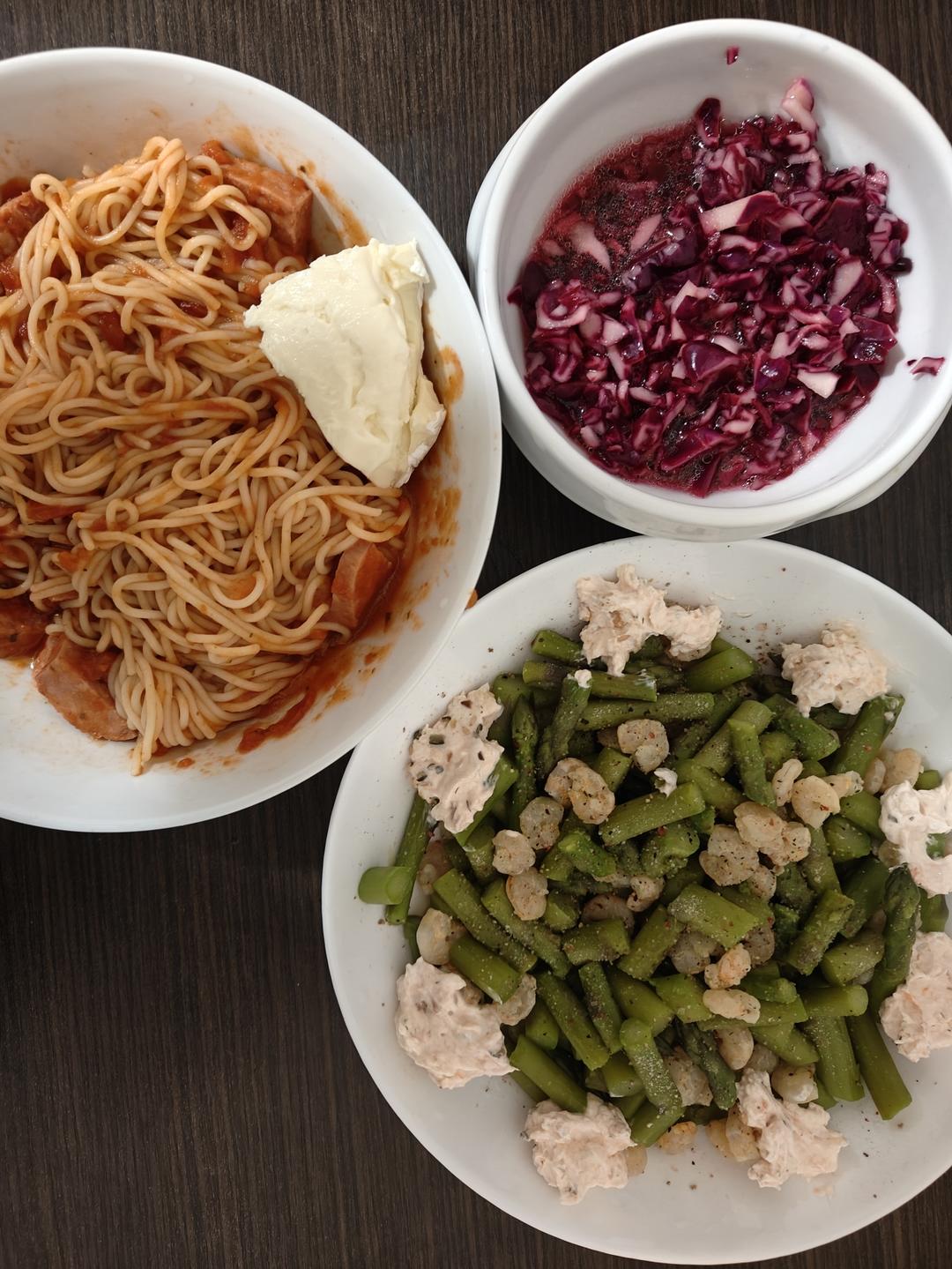 番茄意面+虾仁芦笋+葡萄酒醋拌紫甘蓝