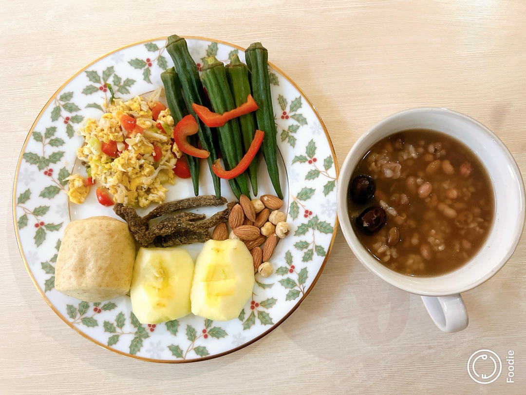 本周打卡第四天:七珍润元粥,小馒头,水果➕蔬菜,银鱼炒鸡蛋,坚果...