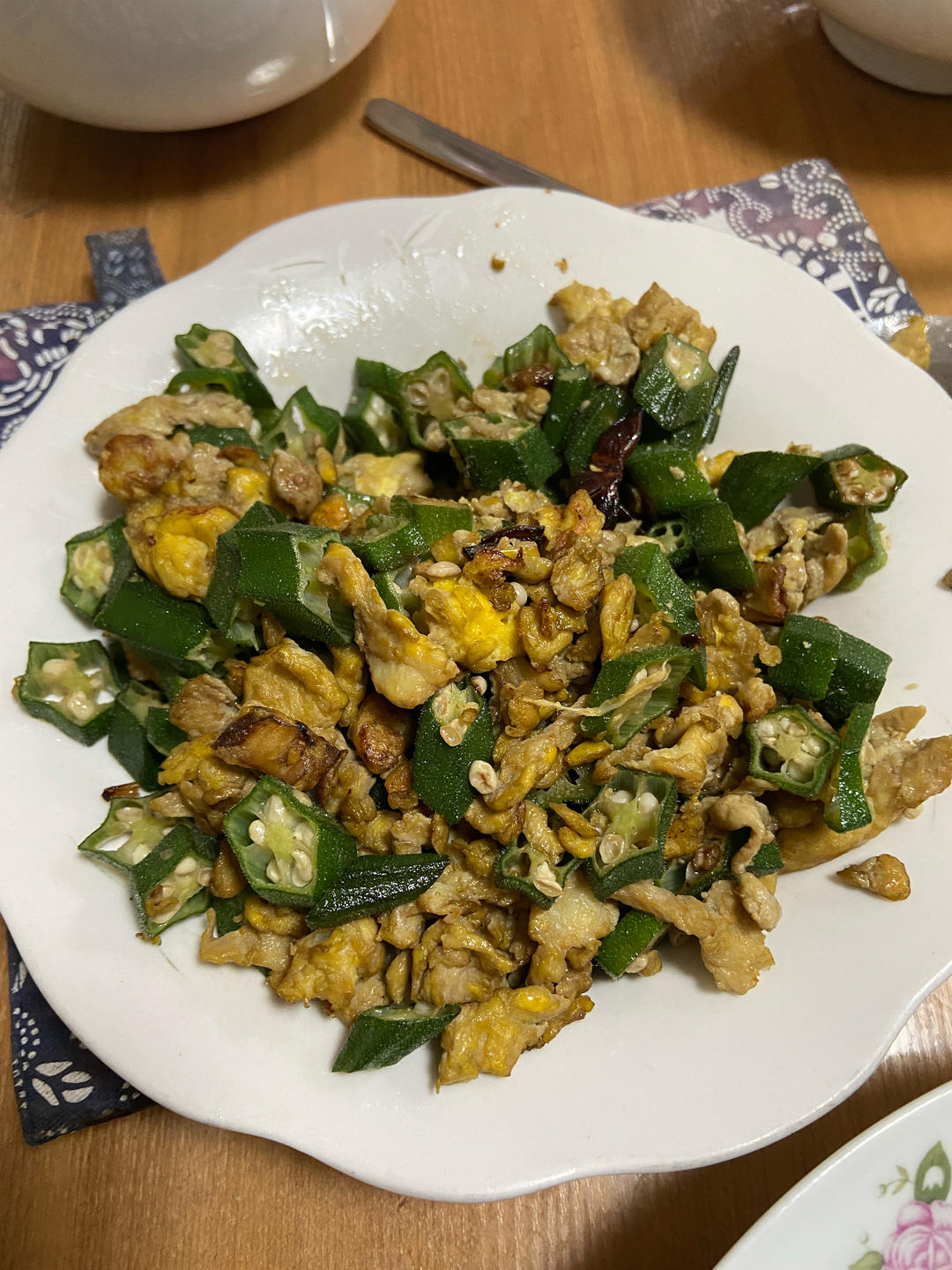 秋葵炒鹅蛋,丝瓜炒毛豆,牛肉丸子粉丝汤