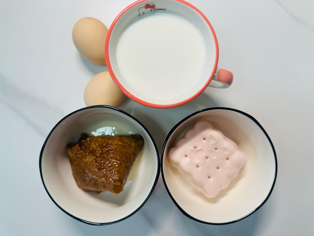 栗子肉粽,饼干馒头(有一点草莓夹心),白煮蛋,牛奶