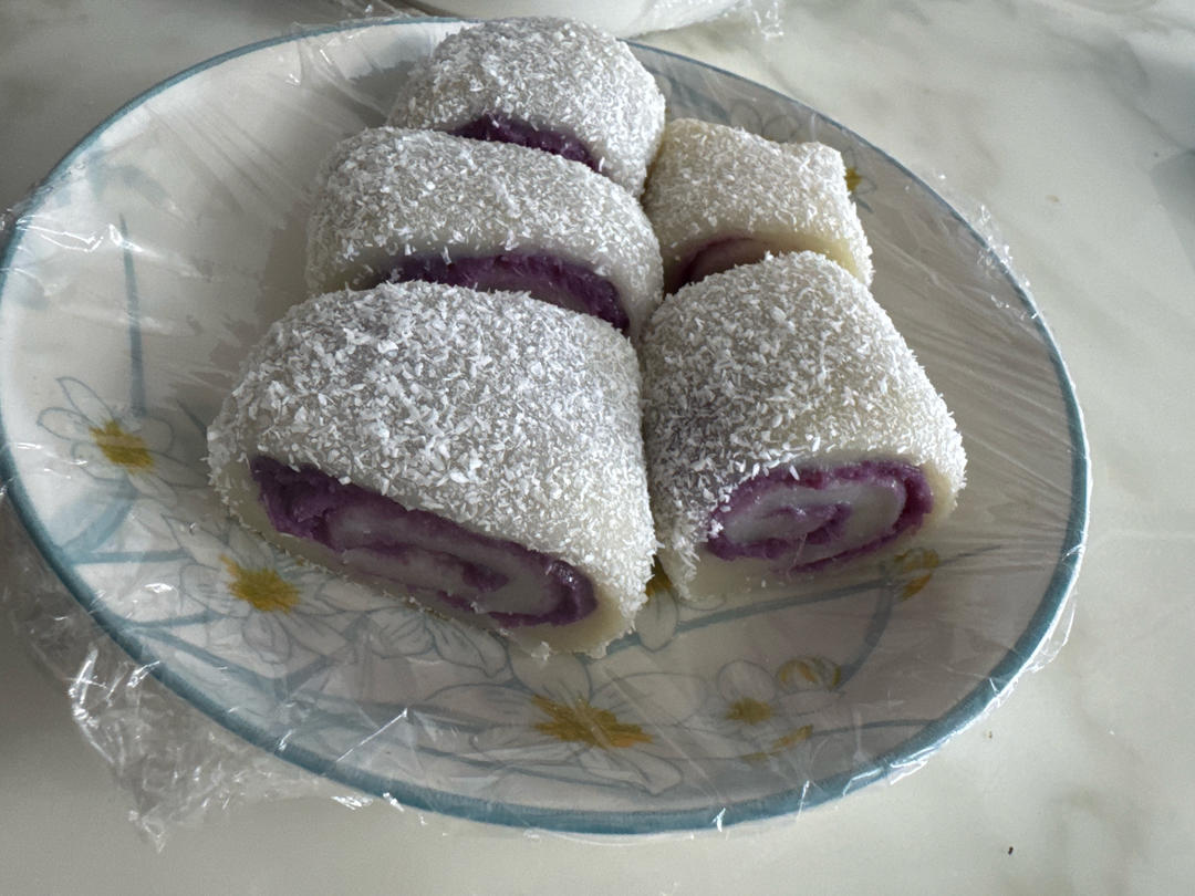 还有点椰蓉,这么一整,软糯香甜的小零食就成了。