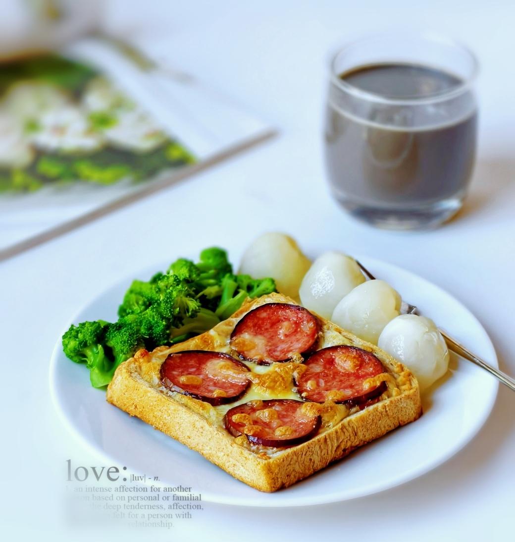 萨拉米肠土司披萨,黑芝麻黑豆核桃三黑豆浆。忘了买虾,冰箱库存也没有了,用萨拉米...