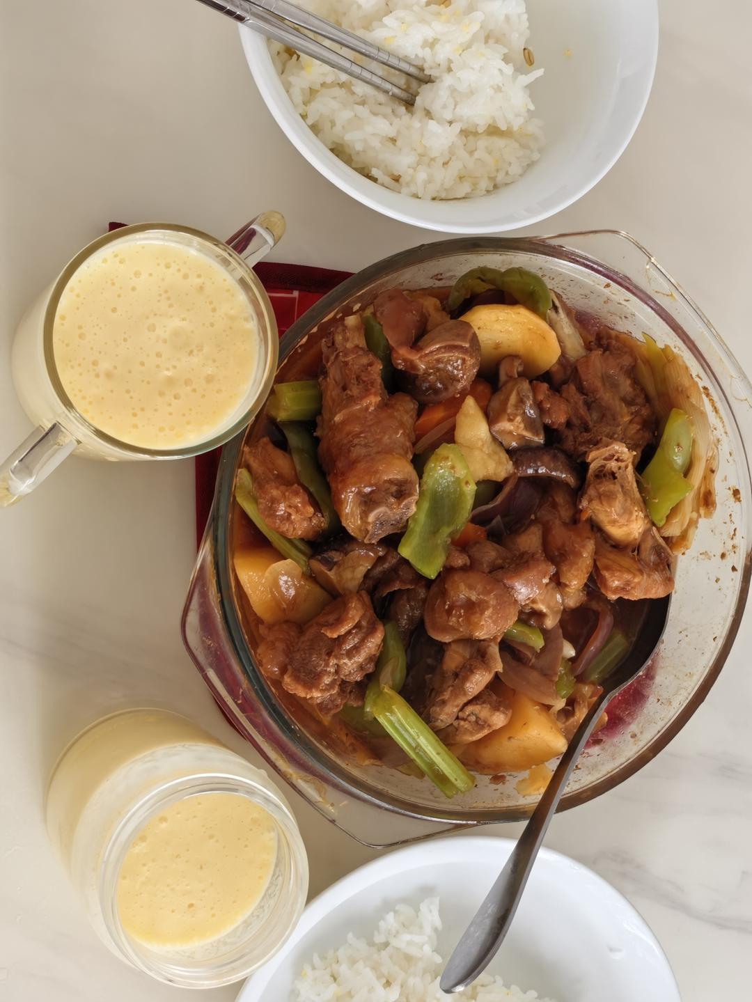 因为熬汤占用了电饭煲,所以第一次蒸饭,并且把卤牛肉放...