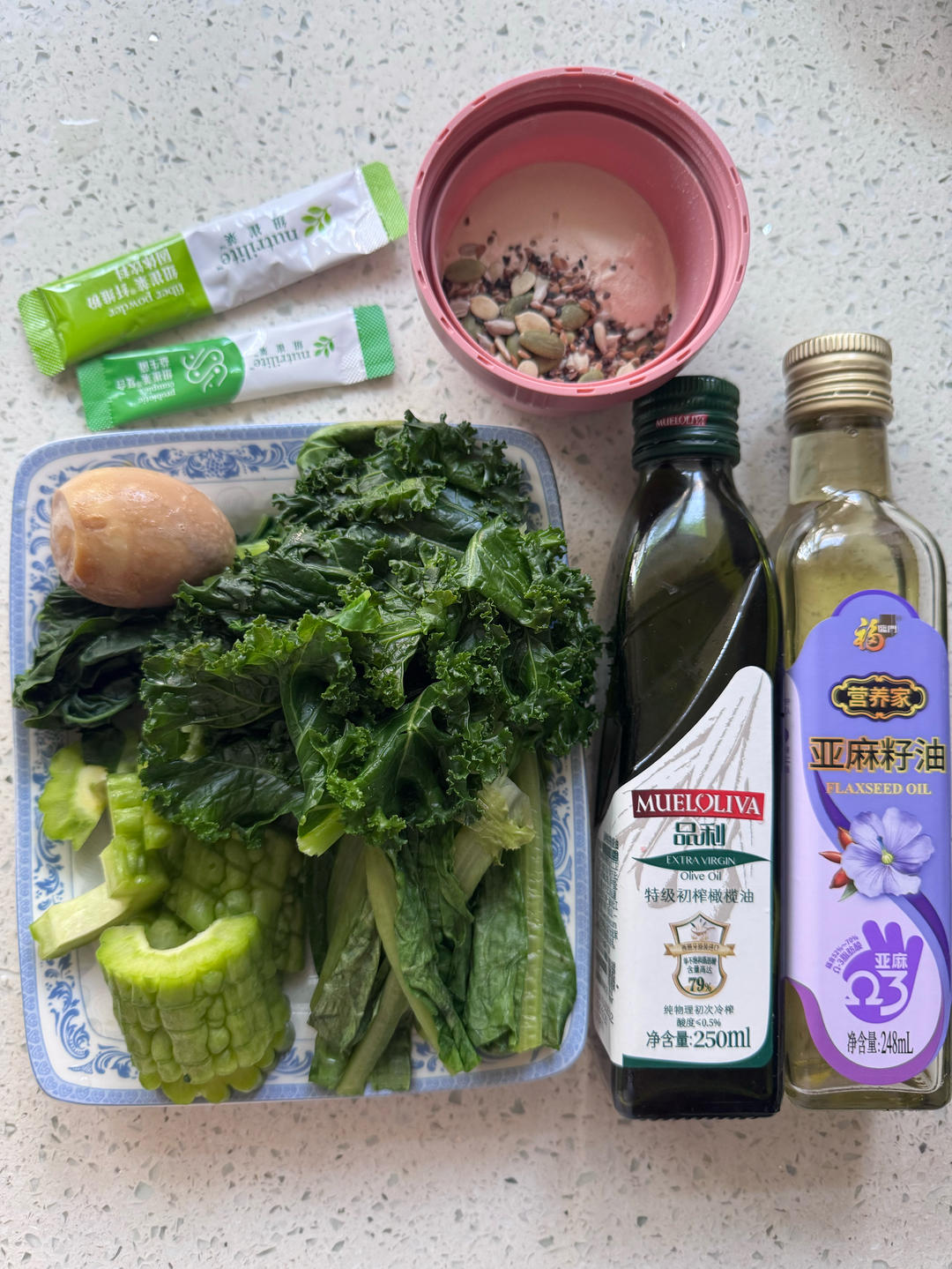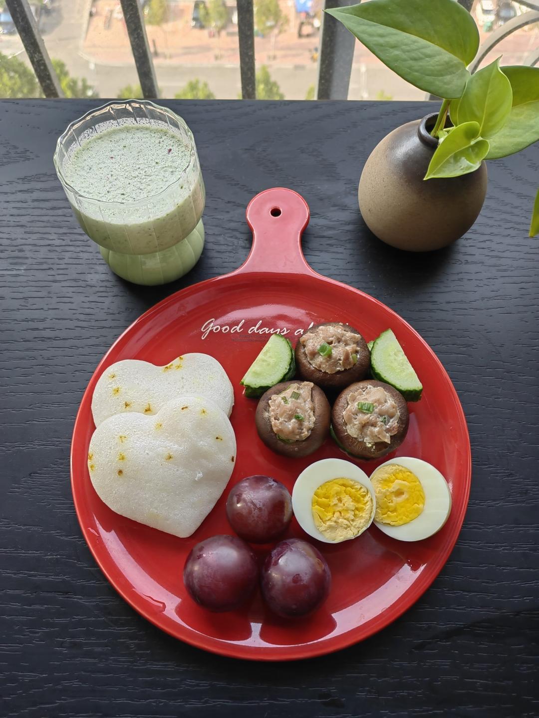 羽衣甘蓝果汁🍹+桂花米糕🍥+香菇酿肉🍄+水煮蛋🥚+葡萄🍇