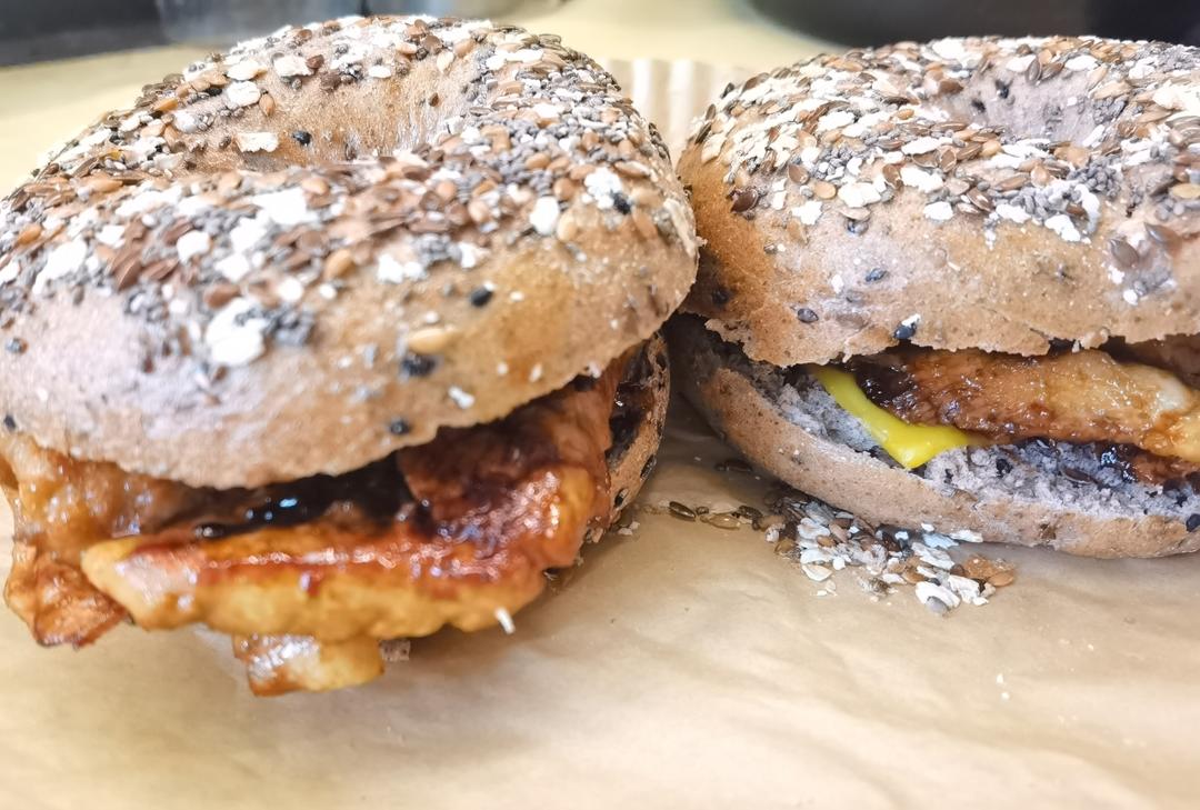 消灭贝果来了,今天煎鸡胸肉夹芝士~肉肉大贝果🥯