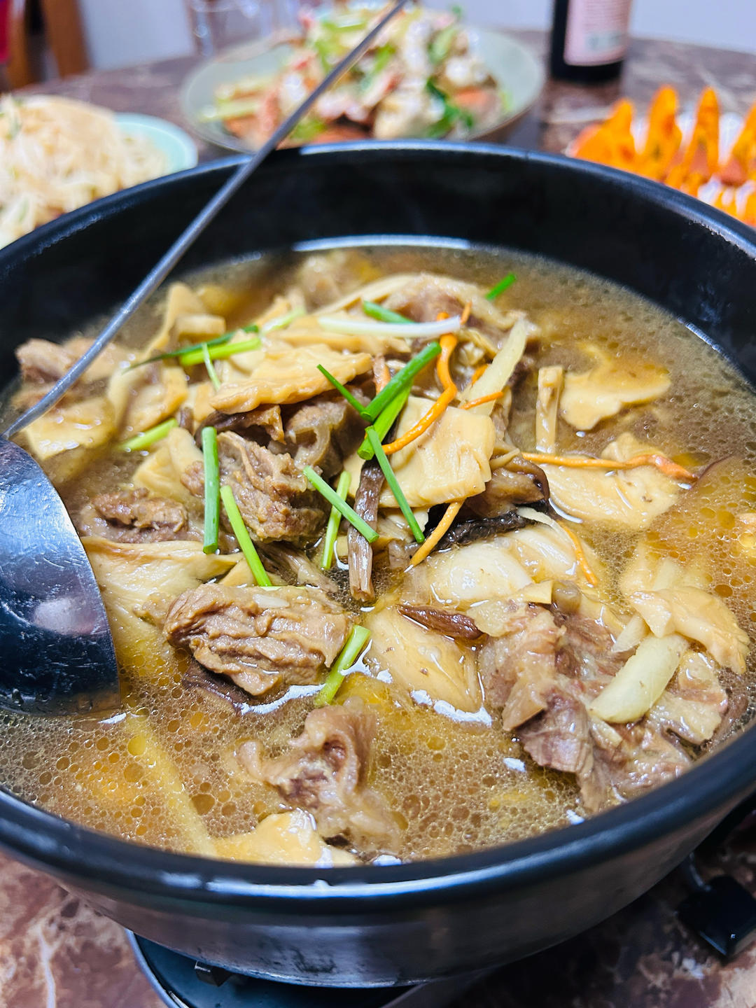 盒马买一赠一的手抓羊肉,哈佛蔬菜汤,和中午没吃完的北非蛋