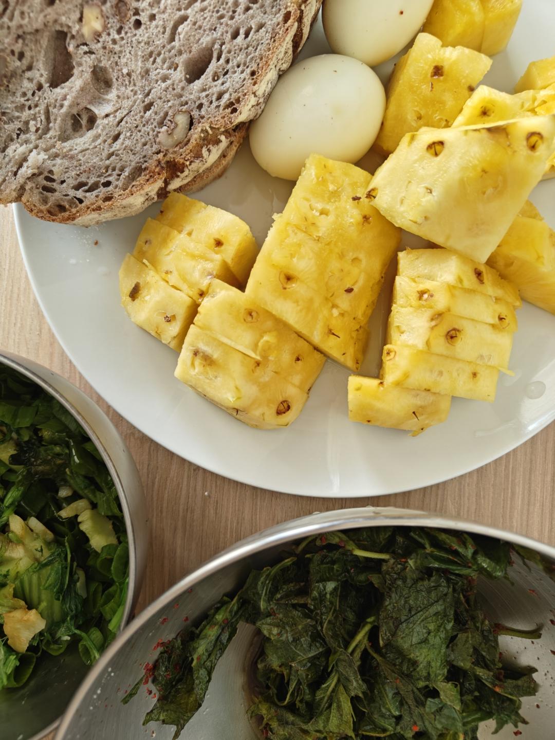 水煮蛋+酱油巴斯克醋花椒油拌葱花西兰花菜心+韩式辣椒粉柚子醋酱油盐拌苏子叶