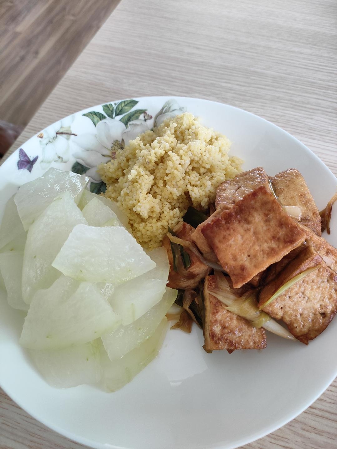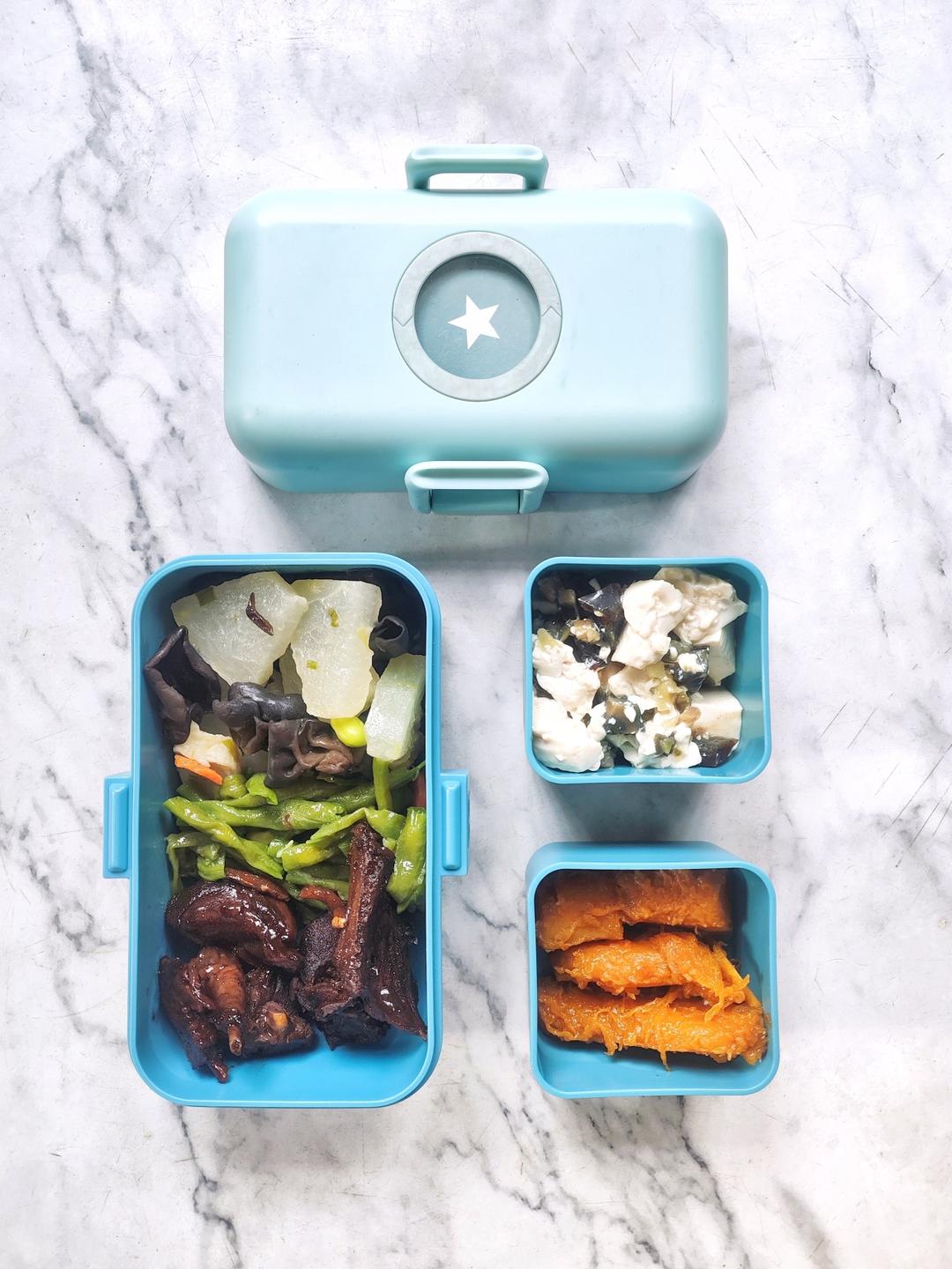 #今日便当:黑木耳冬瓜+清炒豇豆+红烧鸽子+皮蛋拌豆腐+蒸南瓜~~