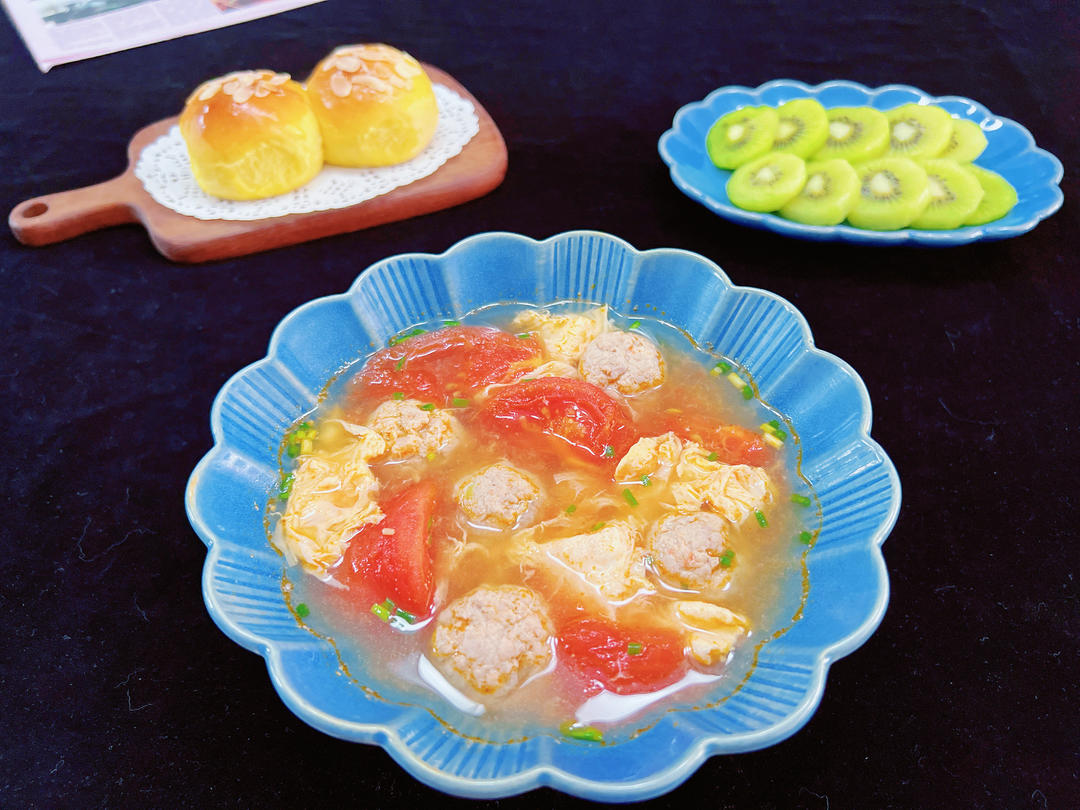 蕃茄鸡蛋丸子汤🍅🍵+南瓜小餐包🥯+加沛即食弥猴桃🥝+煮玉米🌽;图6凑图 出门办事带上自制无糖版牛乳...