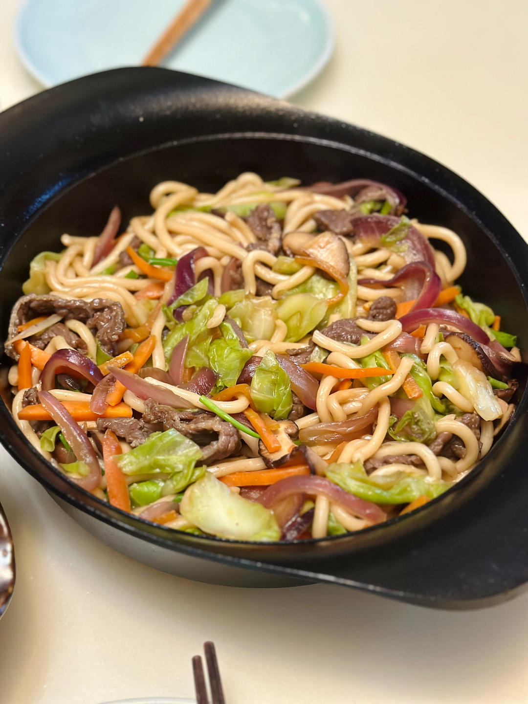 今晚炒乌冬牛肉 烤鸡翅 沙拉菜