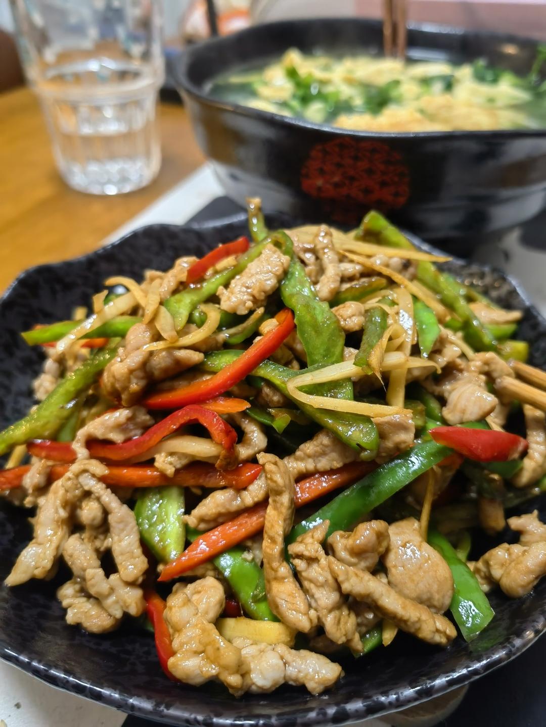 原图,青红椒肉丝加了一些仔姜,好吃。还煮了一个软浆叶(木耳菜)蛋汤。