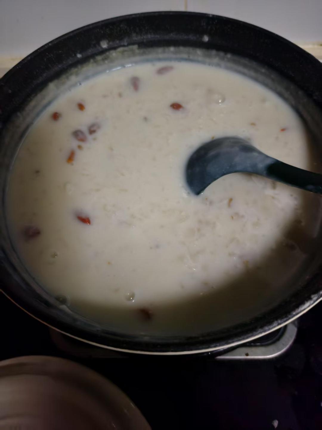 加了枸杞,煮的时候要小火开盖,隔三差五的搅拌,不然会糊底,嘿嘿,超级养生。