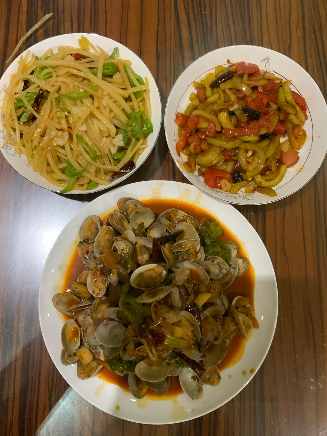 辣炒花甲,西红柿炒西葫芦,酸辣土豆丝。土豆丝切的好粗,刀工是真不行。