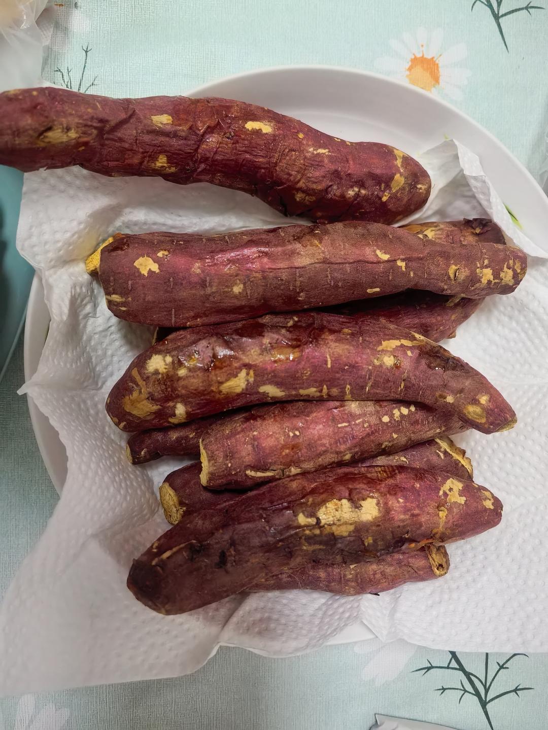 中间翻面前给红薯过了遍水,浸泡了两分钟,烤出来后皮特别好剥。