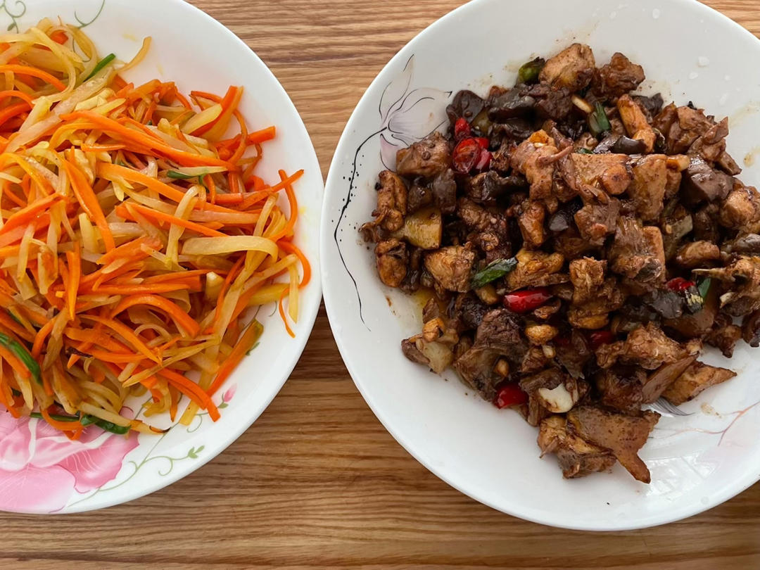 胡萝丝与土豆丝的完美搭配,小米椒与鸡肉的相互碰撞,让今天的晚餐变得更好吃!