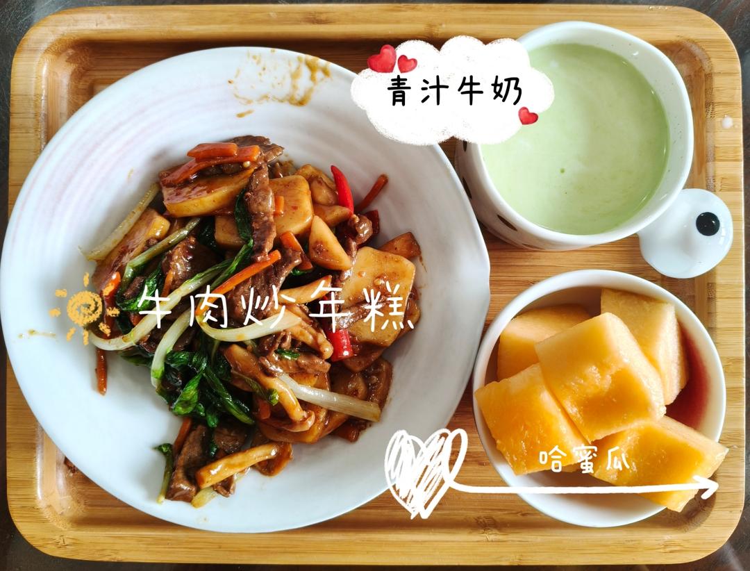 牛肉蔬菜炒年糕、青汁牛奶、哈蜜瓜!