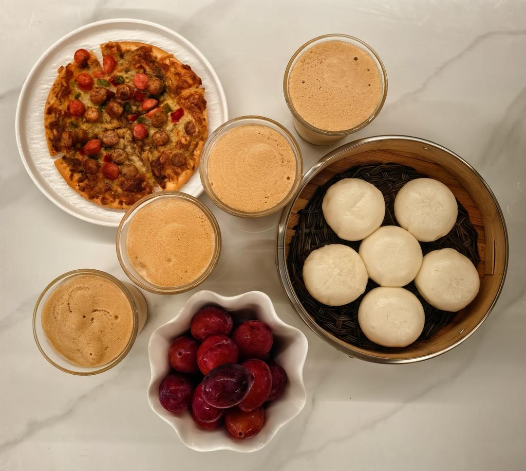 第3055餐:泡沫咖啡、双肠披萨、奶黄包、西梅!
