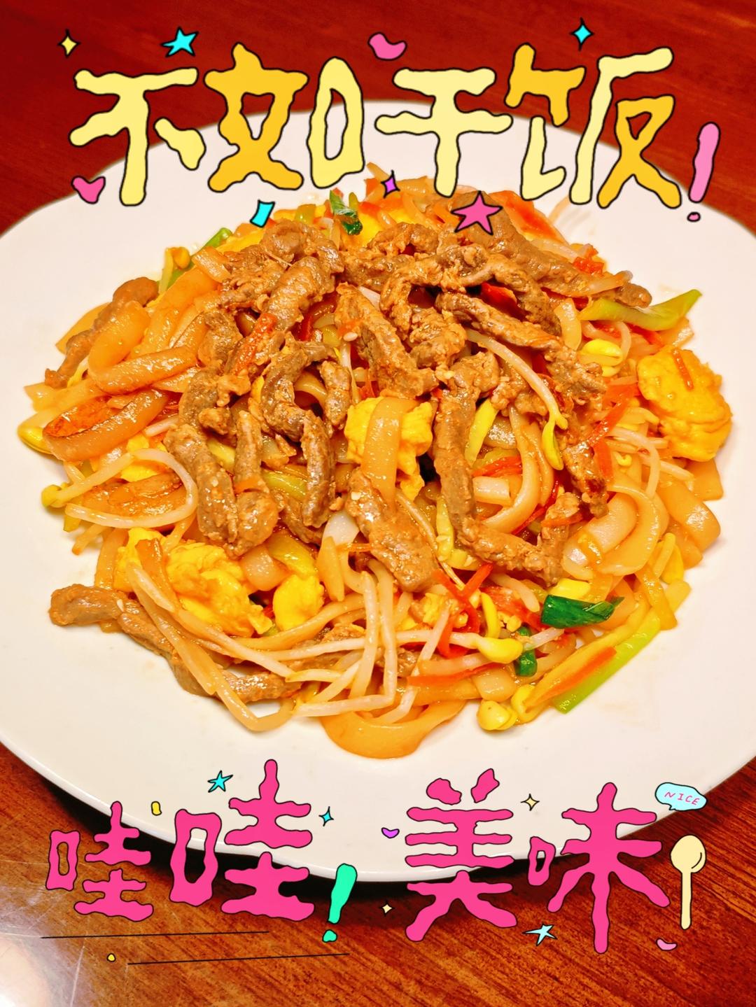 为了盒马免费河粉,买了牛肉和豆芽,翻出冰箱里的大🥚➕小🥒➕小🥕,家中大厨一顿乱炒,成就了干炒牛河,美味不输预制。。。[捂...