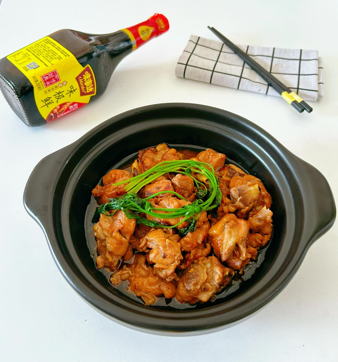 做这道粤菜啫啫鸡煲,我选用味事达味极鲜特级酿造酱油调色...