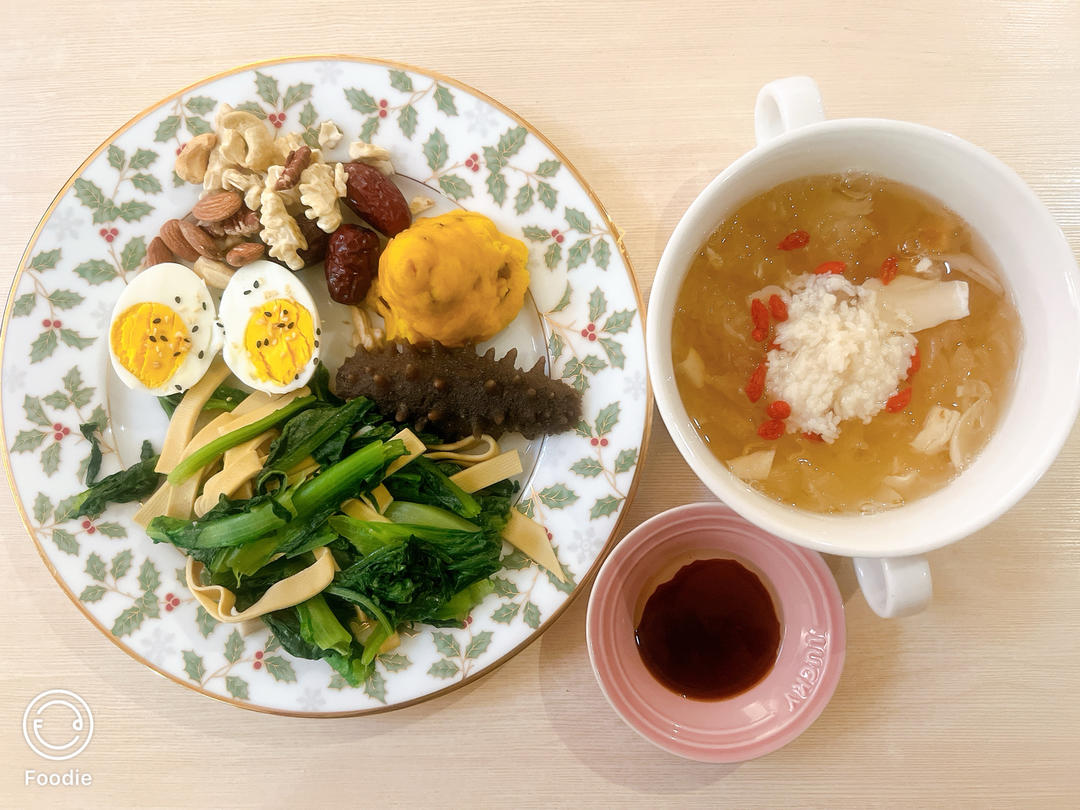 银耳➕酒酿,鸡蛋➕坚果,蔬菜➕海参。今天量大了点,最终窝头没有吃...