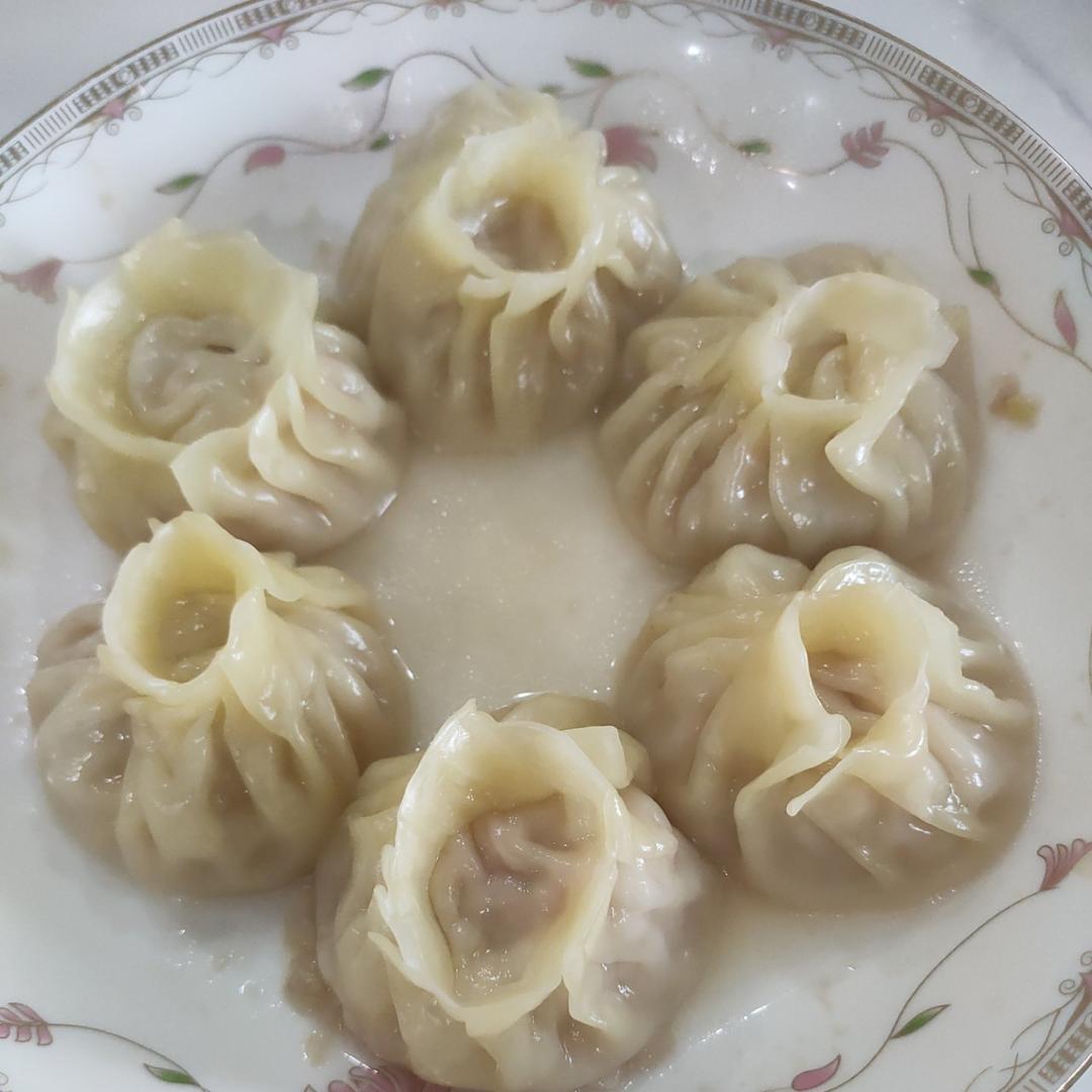 自己的早餐:酱肉包子,茶叶蛋,虾皮冬瓜汤,桃...
