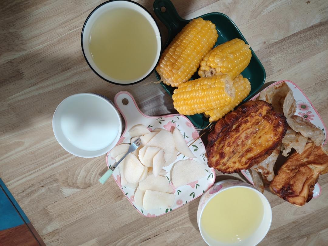 9.28香肠面包~可颂~煮玉米~牛奶~手抓饼~秋月梨