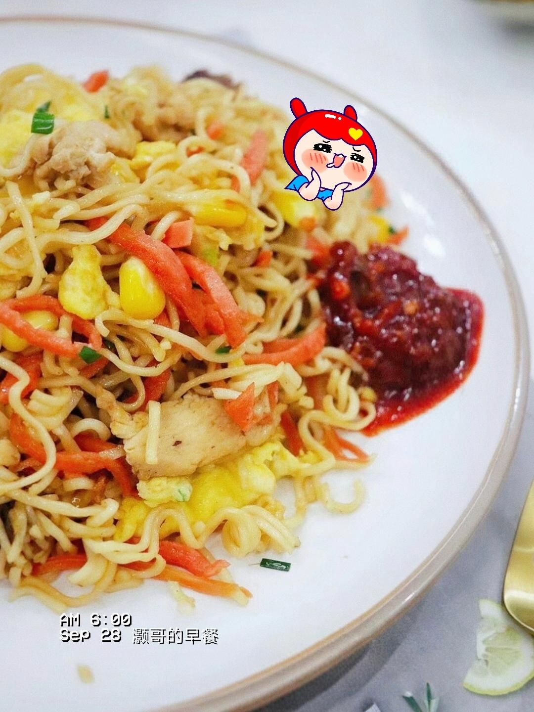 今日早餐:蔬菜瘦肉炒面+排骨六味汤+水果。