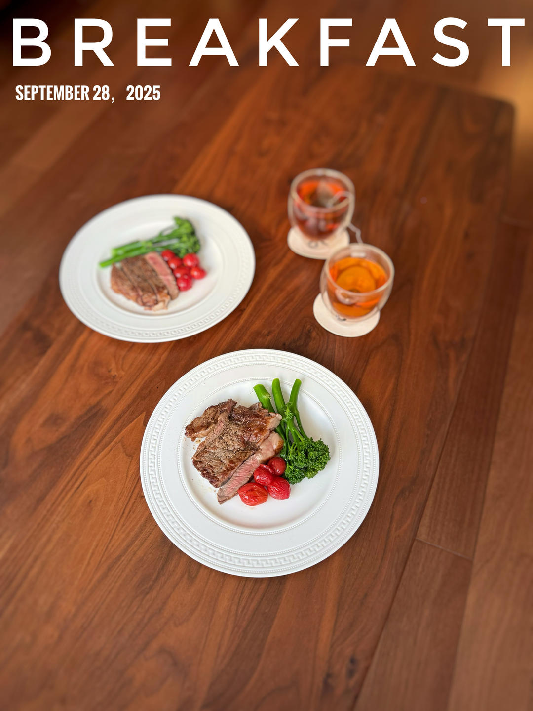 早,煎牛排、西蓝苔赫西红柿。