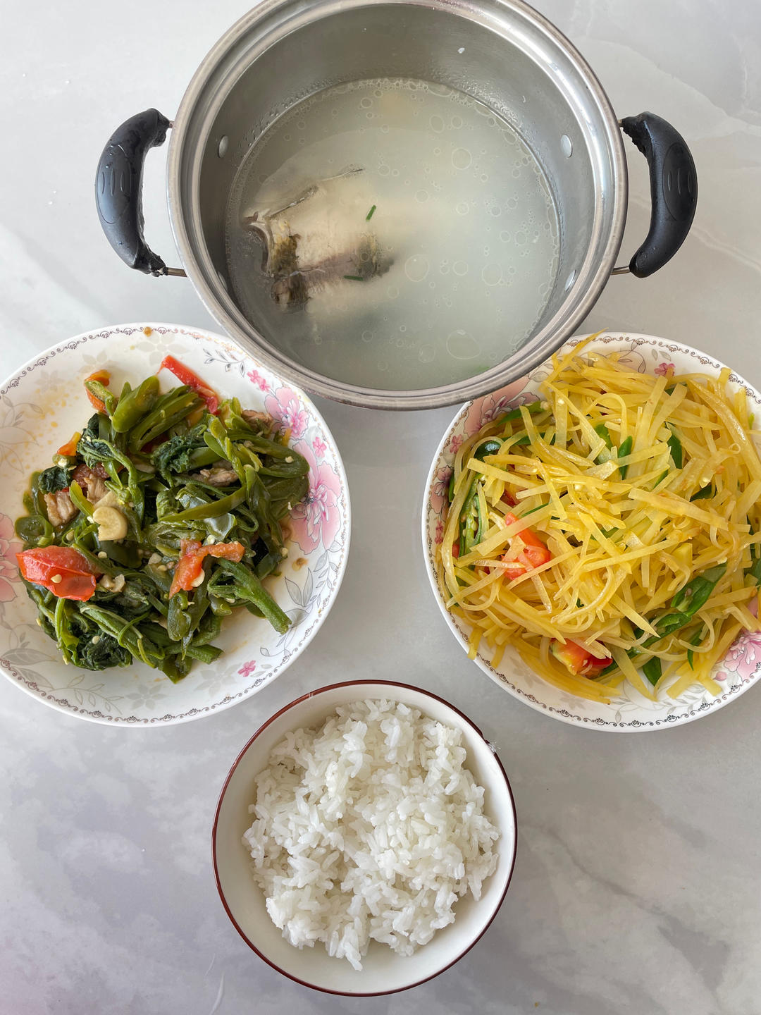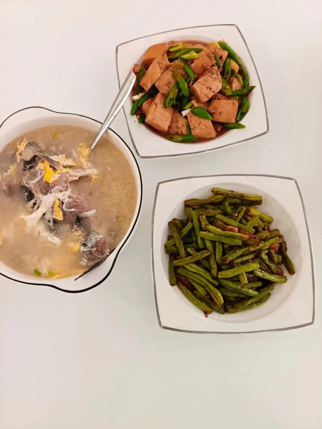 鲫鱼蛋花汤,辣椒焖豆腐,清炒四季豆