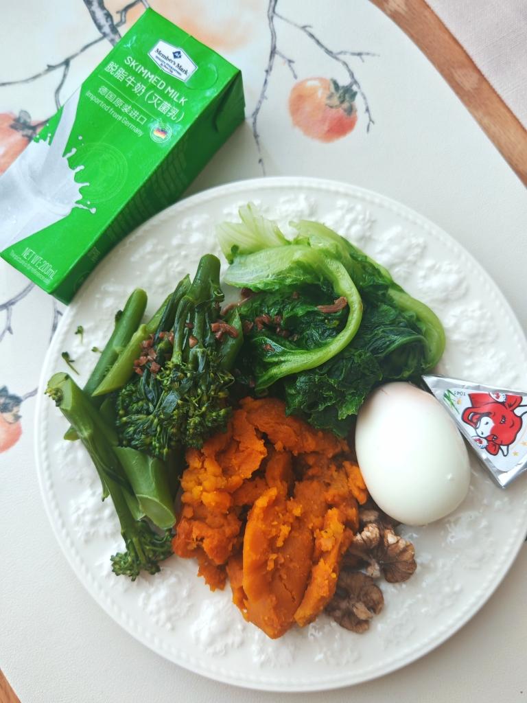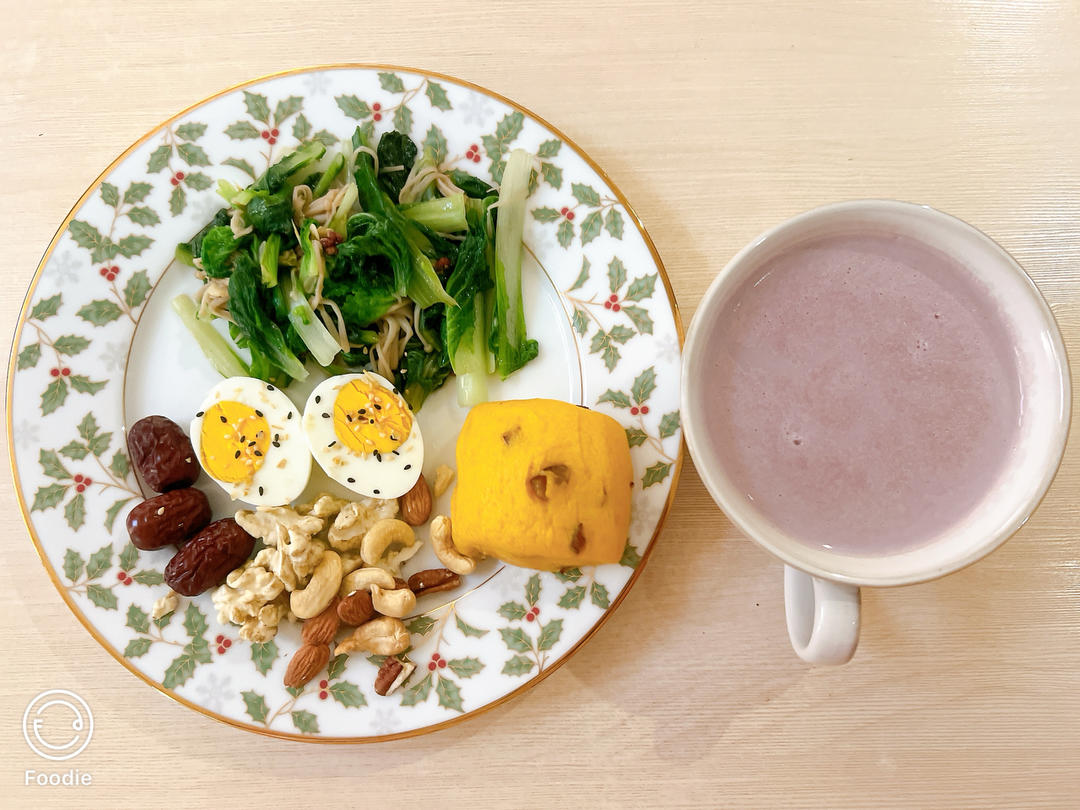 紫薯豆浆➕南瓜玉米红枣馒头,鸡蛋➕坚果,蔬菜。