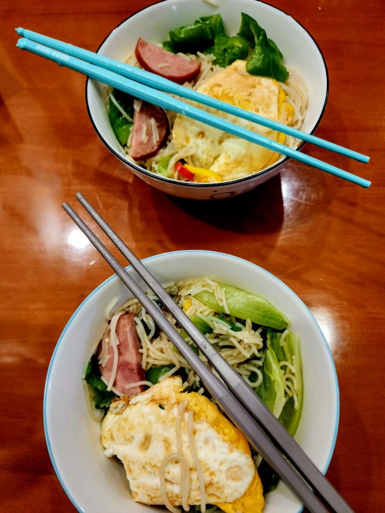 节日快乐,肉丝炒米粉、阿华田、水果!