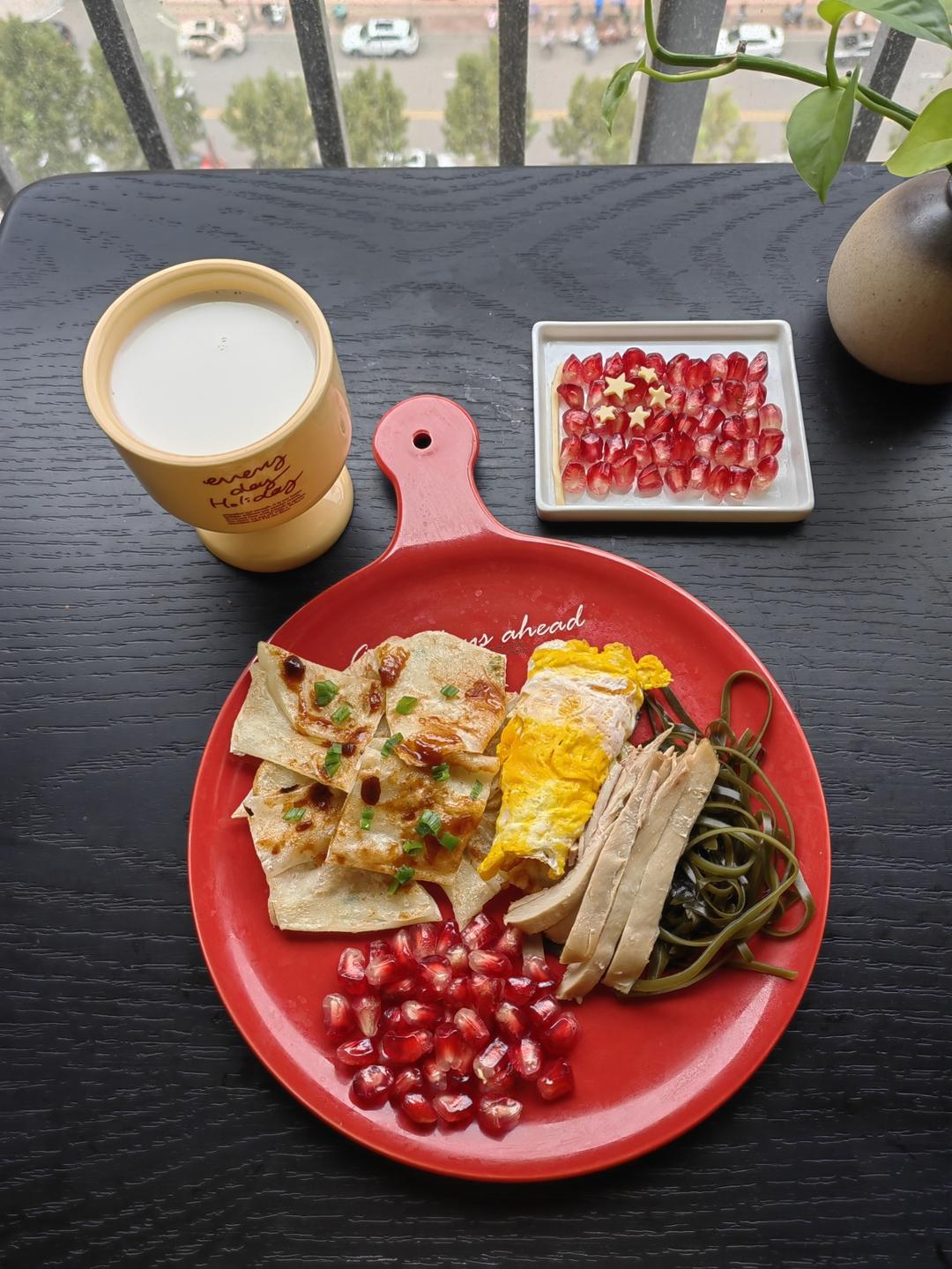 牛奶🥛+酱香饼🍕+煎鸡蛋🍳+鸡胸肉🐥+海带丝🥬+石榴