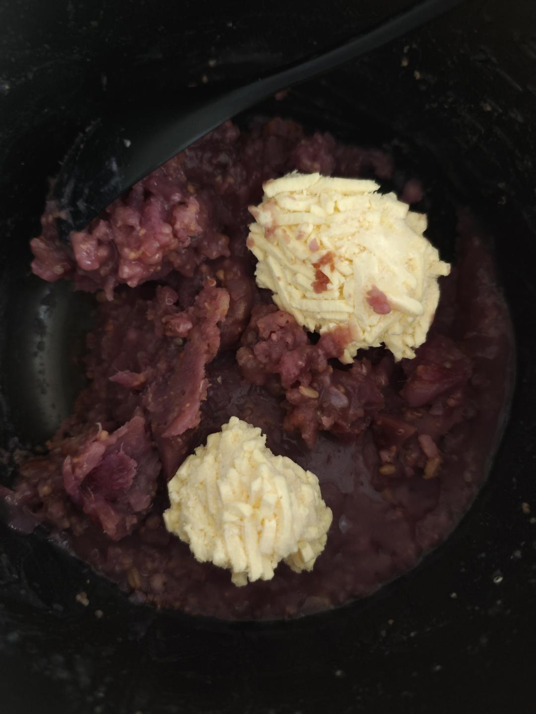 5个紫薯加杂粮粥1份,加一指半水,一次煮饭键这样软糯,然后加上闺女爱吃的芝士,就可以拉丝...